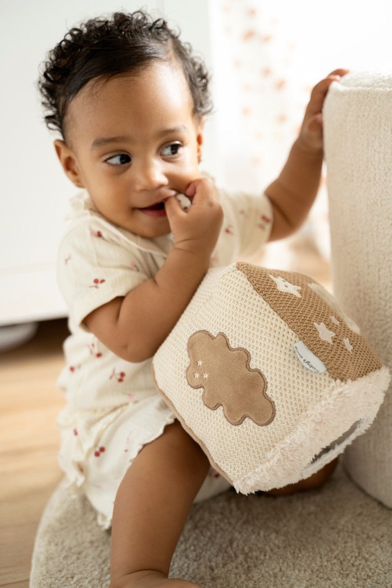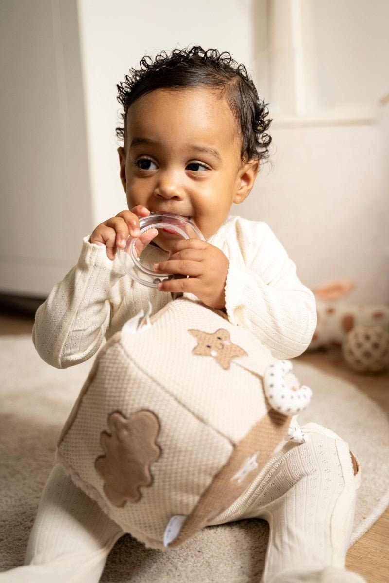 De Heaven activiteitenkubus brengt spel, rust en ontwikkeling samen in één knuffelzachte vorm – speciaal ontworpen voor de eerste ontdekkingen van je kleintje.