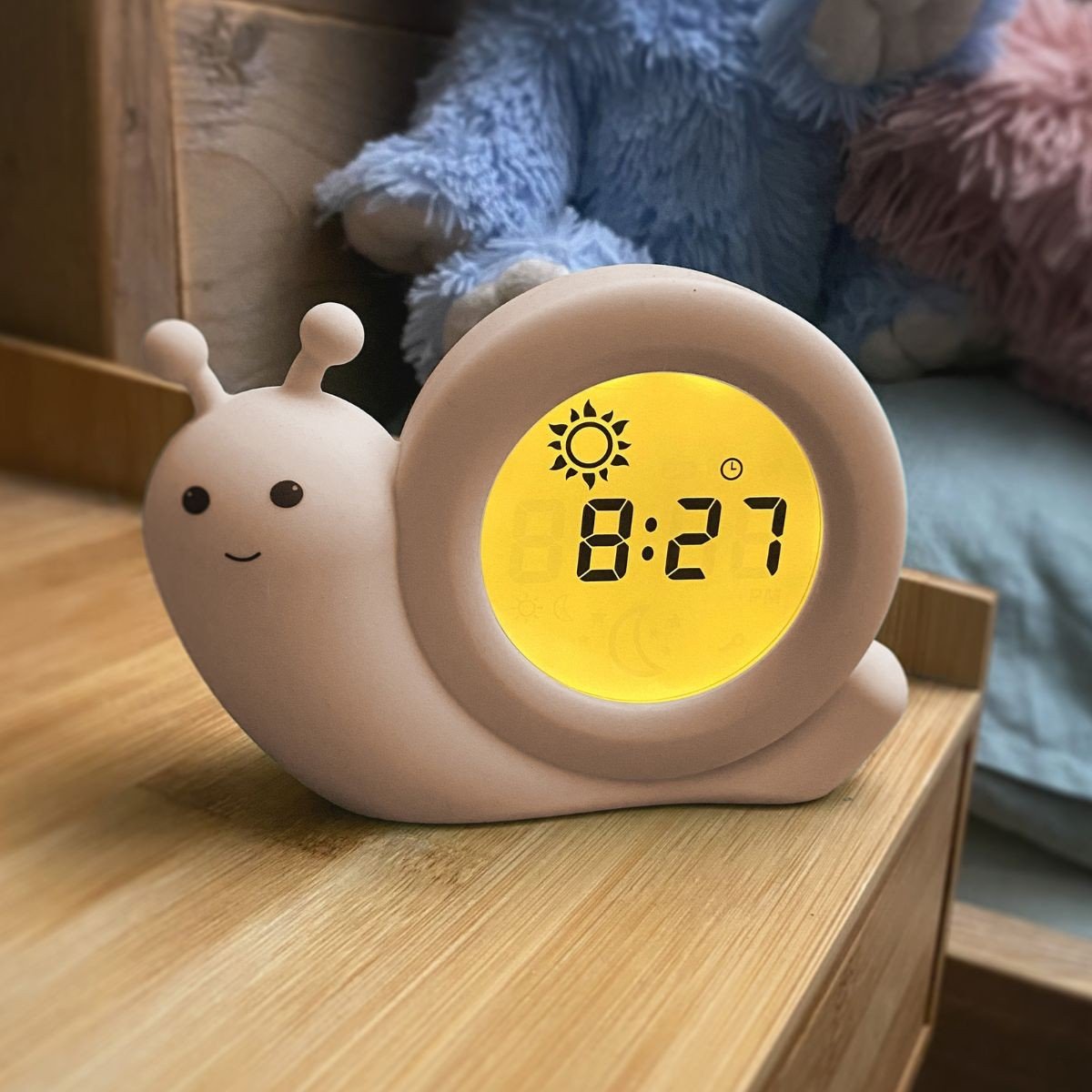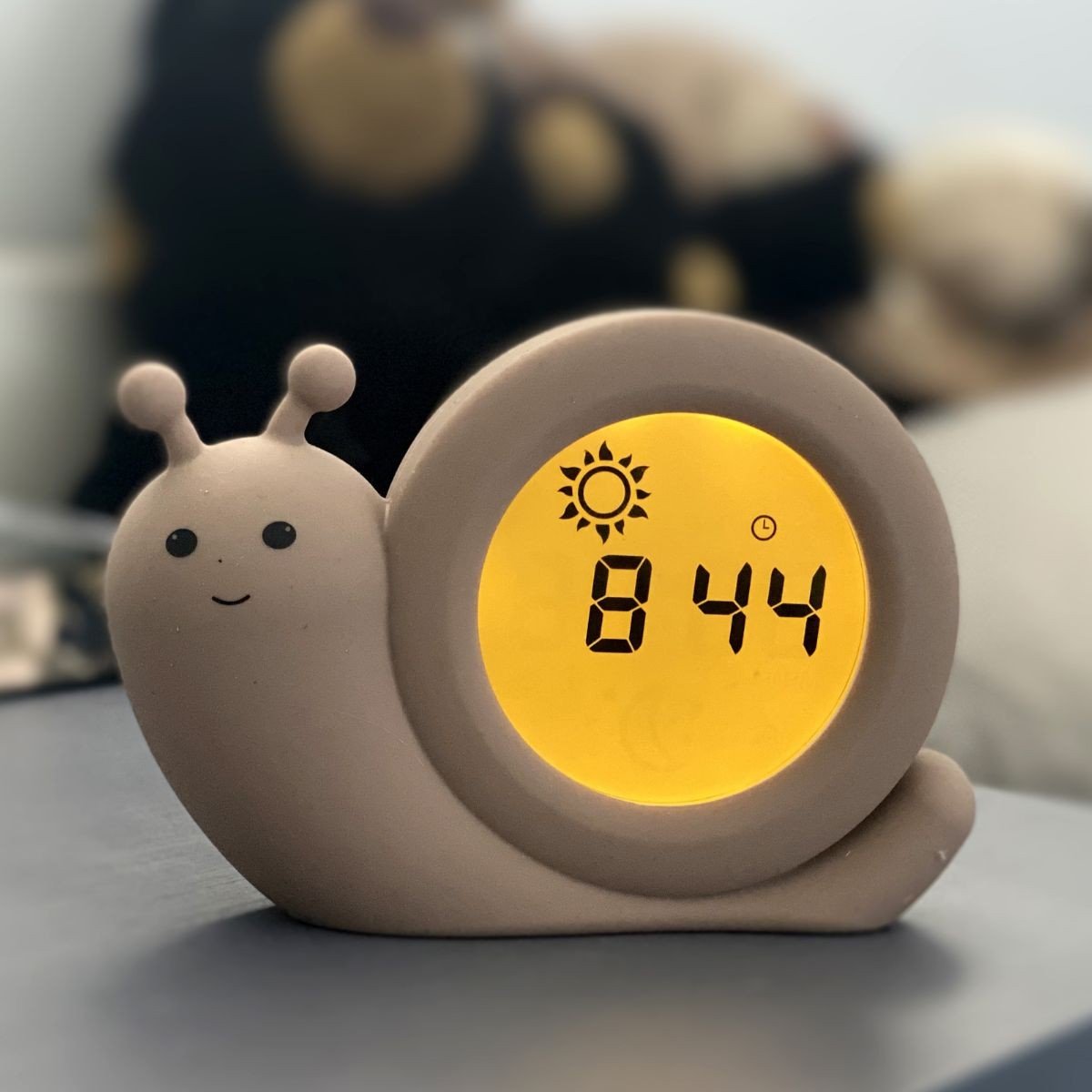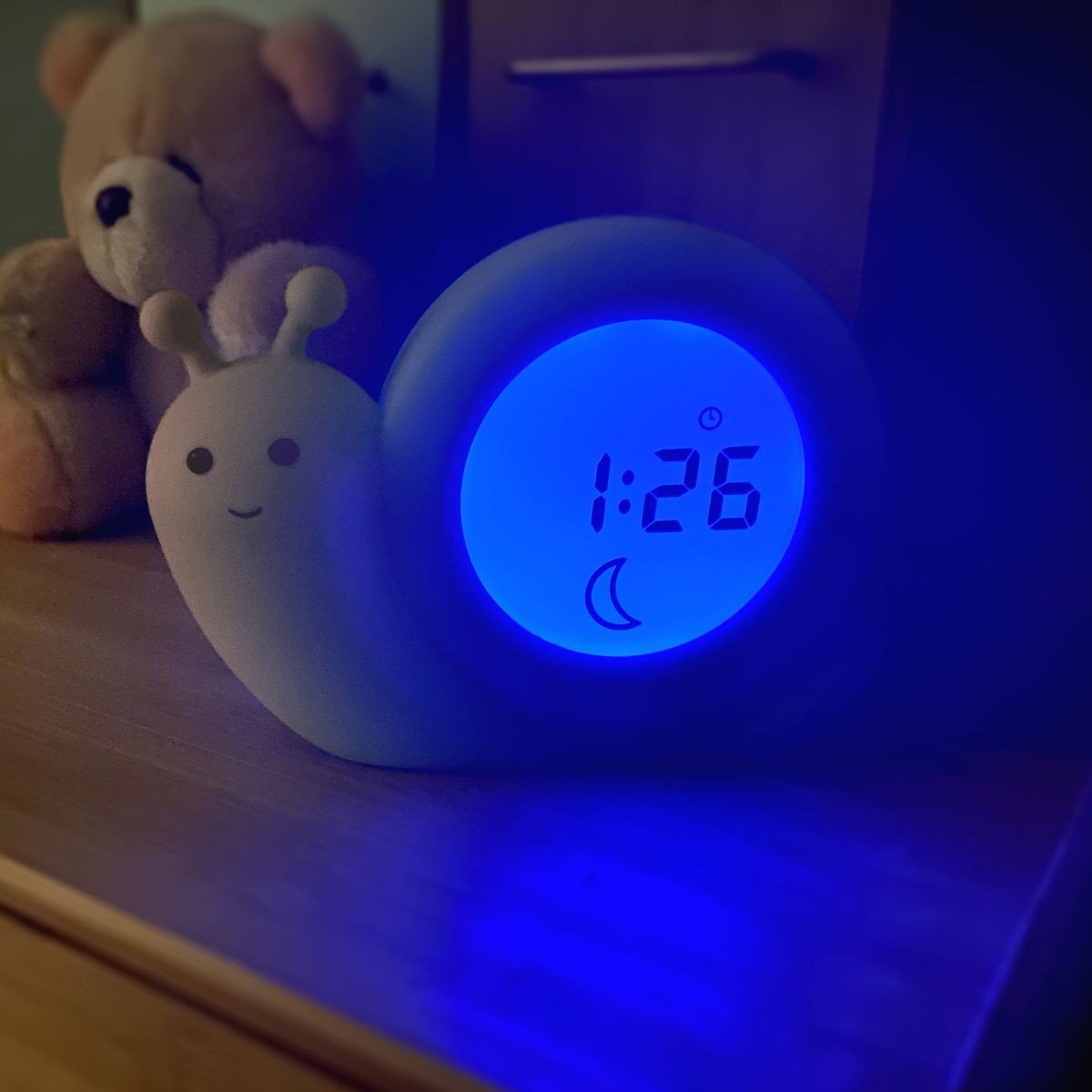 De BC110BE SIMON van Alecto Baby is een 3-in-1 slaaptrainer, wekker én nachtlampje. En dat in de vorm van een vriendelijk slakje, Simon genaamd. Deze slaaptrainer helpt kleinere kindjes met het krijgen van tijdsbesef. Als ouder stel je in wanneer het tijd is om op te staan. Het display is 's nachts blauw en toont een maantje. Hét teken om in bed te blijven. Is het tijd om op te staan? Het display van de BC110BE SIMON wordt oranje en laat een zonnetje zien. De BC110BE SIMON wordt geleverd met een extra lange kabel (200 cm), maar is ook oplaadbaar en daardoor ook mee te nemen en draadloos te gebruiken.