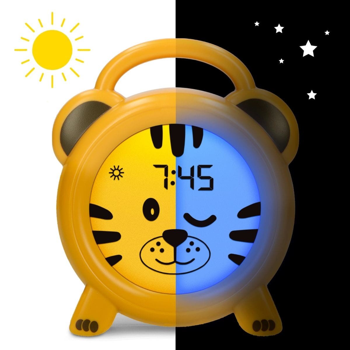 Deze handige nachtlampwekker werkt op een inventieve manier. Hij laat je kind automatisch wennen aan het moment om te slapen en ook wanneer je kind mag opstaan. Als ouder stel je eenmalig de slaaptijd en de wektijd in. Bij slaaptijd kleurt het display blauw en het tijger doet zijn ogen dicht. Vanaf de wektijd kleurt het display oranje en opent het tijger zijn ogen.