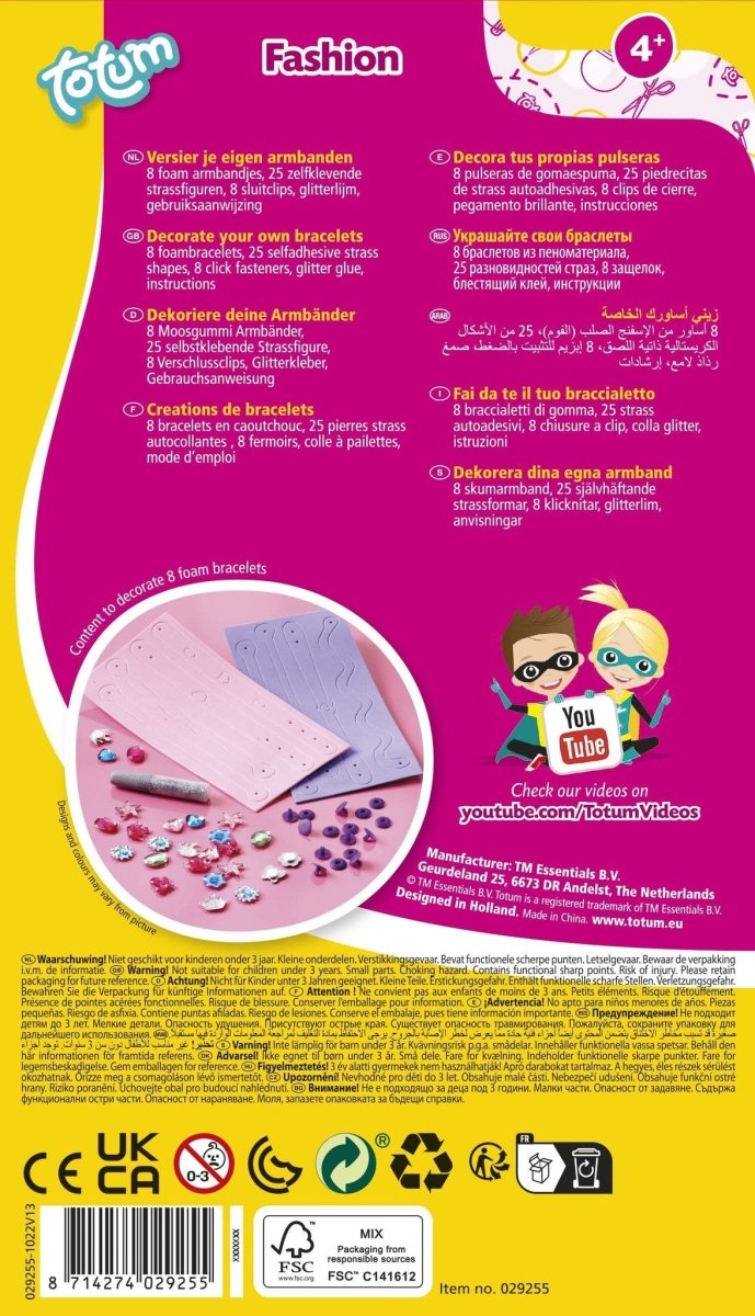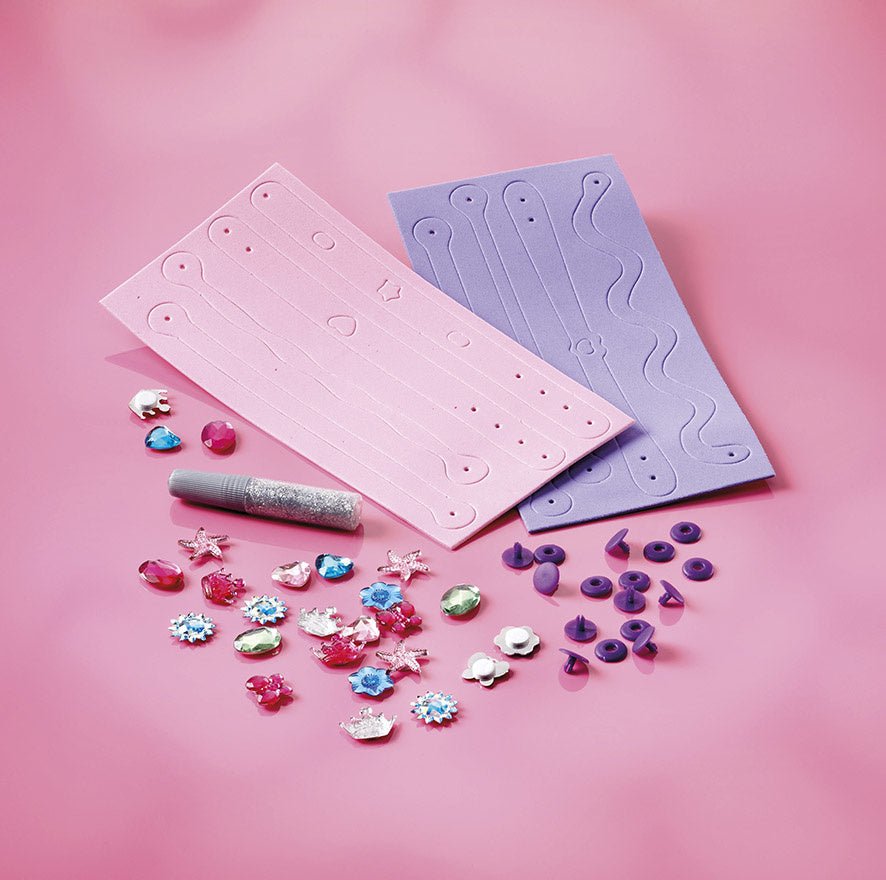 Maak een hele serie armbandjes van gekleurd foam. Beplak ze met strass steentjes in de vorm van kroontjes, vlinders, hartjes en bloemetjes en maak het af met zilver glitterlijm. Knutselen doe je met Totum!