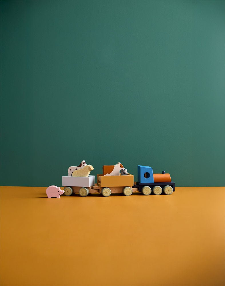 Allemaal aan boord van de boerderijtrein! Deze houten trein heeft twee wagons die zijn ontworpen om vijf boerderijdieren te vervoeren: Mira de koe, Max het paard, Poppy het varken, Bella het schaap en Sture de kat. Kinderen kunnen de dieren in de wagons laden en hun eigen verhalen verzinnen terwijl ze de trein voortduwen. De dieren kunnen worden verplaatst en op verschillende manieren worden neergezet, wat zorgt voor talloze speelmogelijkheden. De trein bevat ook drie stapelbare houten blokken voor extra plezier met sorteren, stapelen en balanceren.