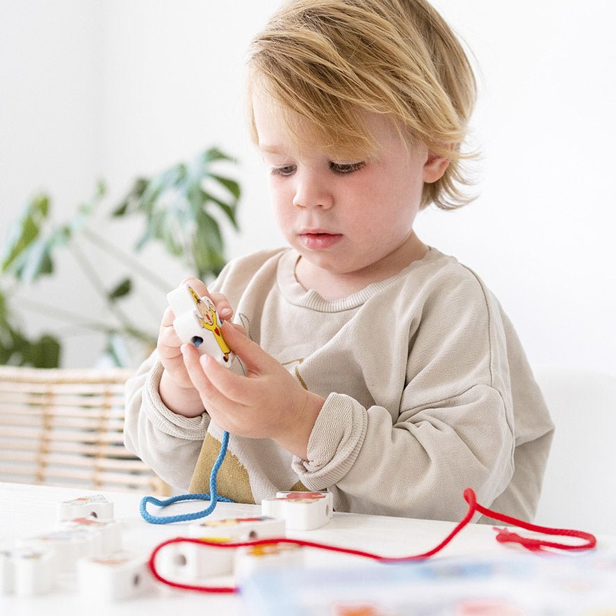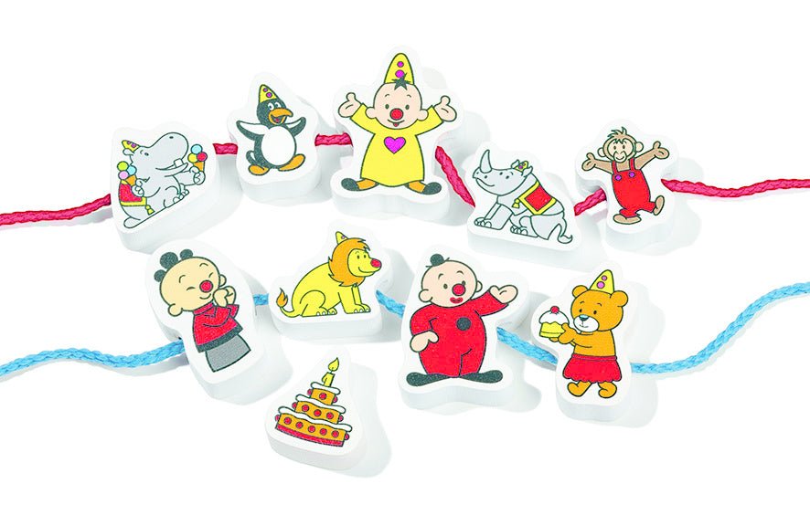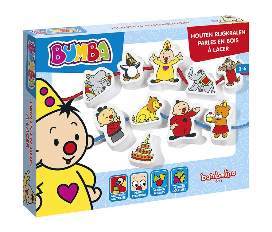 Set van massief houten rijgkralen met afbeeldingen van Bumba, Bumbalu en hun vriendjes. De kralen zijn extra groot en met een ruime uitsparing zodat kleine handjes ze makkelijk aan een veter kunnen rijgen. Inclusief 2 veters om aan te rijgen.