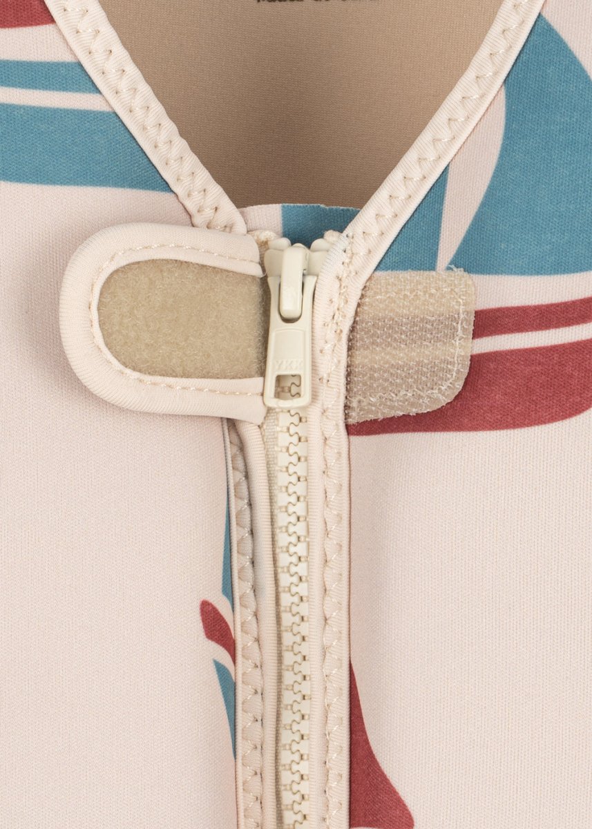 Het vest heeft een stevige rits aan de voorkant en een veiligheidsgordel tussen de benen, zodat het niet kan afglijden. Voor optimaal comfort raden we aan het vest te dragen over zwemkleding die armen en benen bedekt.