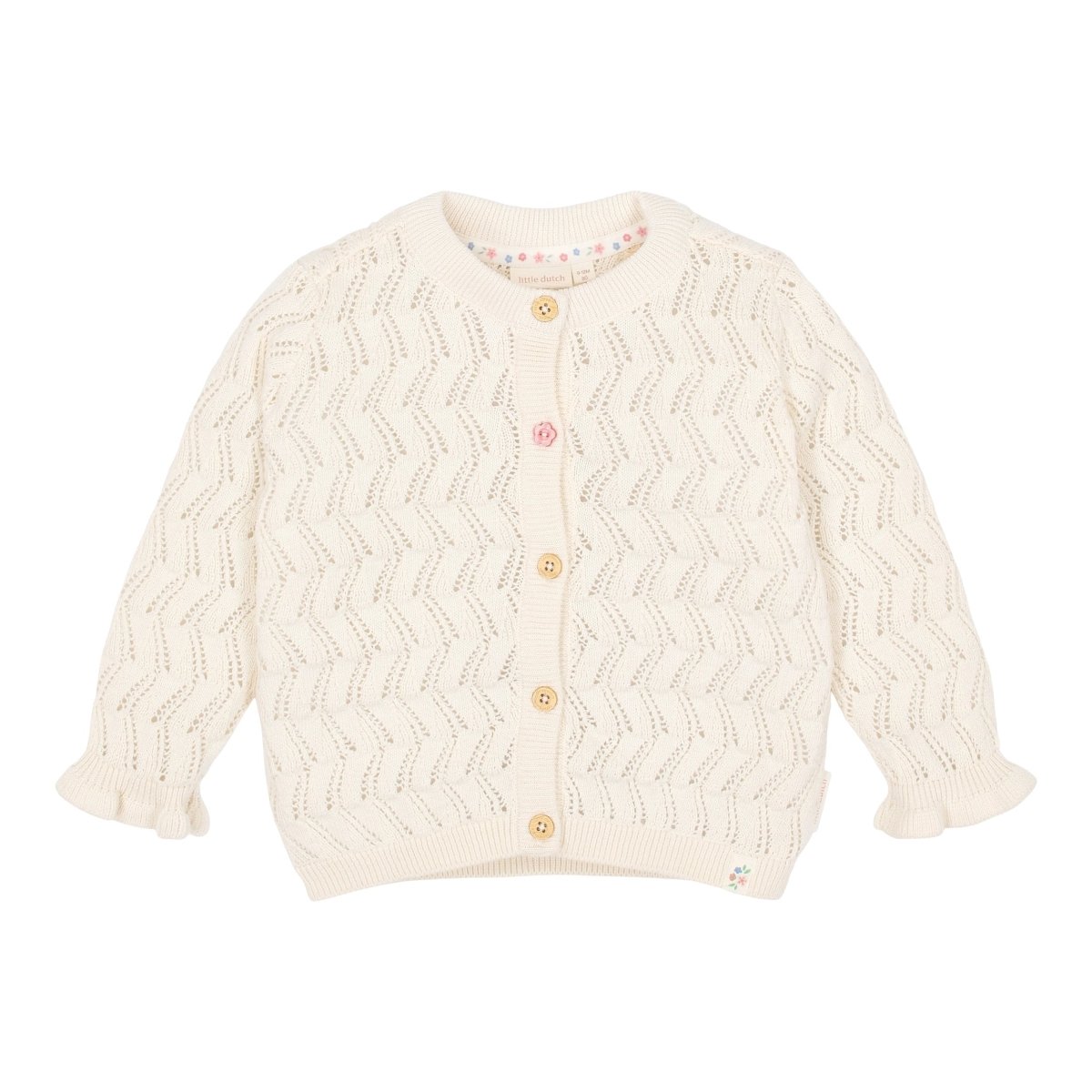 De ruches aan de mouwen geven het vest een speels en lief silhouet. De hout-look knoopjes en het bijzondere knoopje in de vorm van een bloem zorgen voor een warme, liefdevolle finishing touch. Gemaakt van biologisch katoen en Oeko-Tex gecertificeerd – voor een veilige en verantwoorde keuze, elke dag weer. Prachtig over een jurkje of blouse, voor momenten om te bewaren.