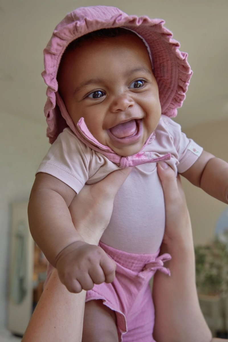 Zonnetje in zicht? Dan is dit luchtige hoedje in Pink Blush onmisbaar. Gemaakt van lichte mousseline stof en afgewerkt met een fijn geborduurd bloemetje op de rand – een subtiel detail dat prachtig aansluit bij de rest van de collectie. Dankzij de zachte striklintjes blijft het hoedje goed zitten, ook wanneer je kleintje vrolijk beweegt. Een lief en praktisch accessoire dat stijl en bescherming moeiteloos combineert. Gemaakt van biologisch katoen en Oeko-Tex gecertificeerd – voor een veilige en verantwoorde keuze, elke dag weer.
