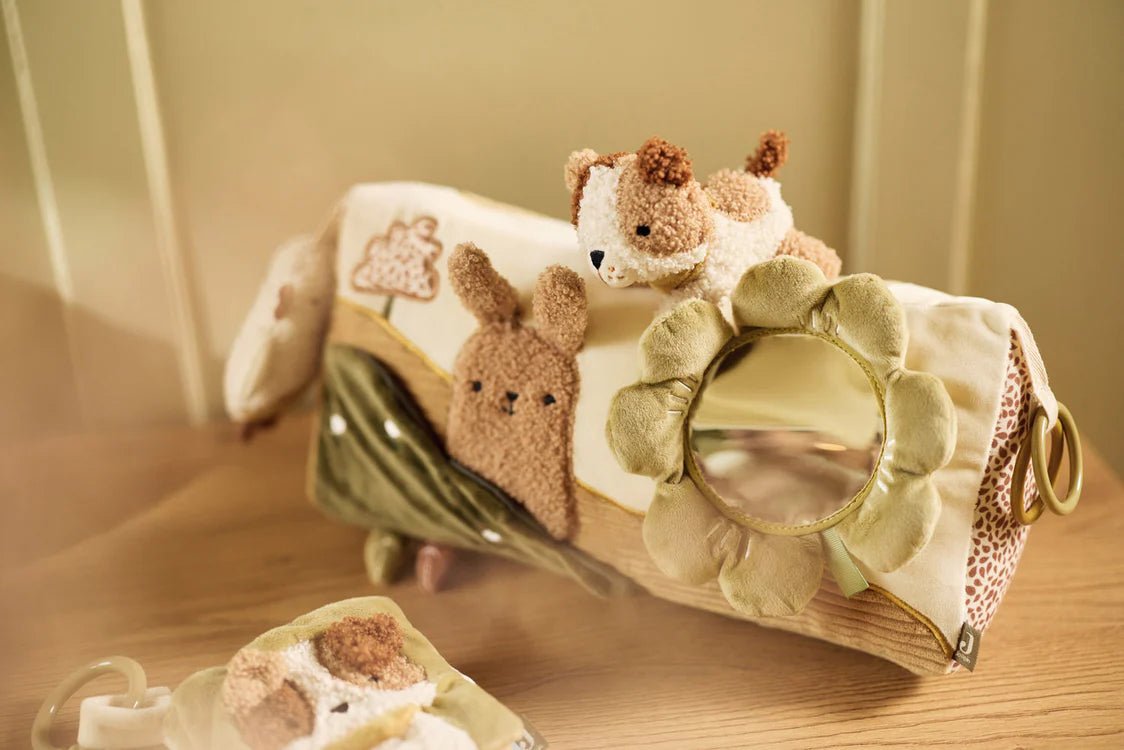 Deze schattige activiteiten driehoek uit de Tiny Park collectie is een must-have voor de box van je baby. Het kussen is versierd met vrolijke borduursels van een hondje en een konijntje, wat zorgt voor een speelse uitstraling. De driehoek bevat diverse attachments, waaronder een spiegel die ideaal is voor tummy time. Met zijn zachte materialen en leuke details biedt deze activiteiten driehoek uren speelplezier en draagt hij bij aan de ontwikkeling van je kleintje. Een perfecte aanvulling op de Tiny Park collectie!
