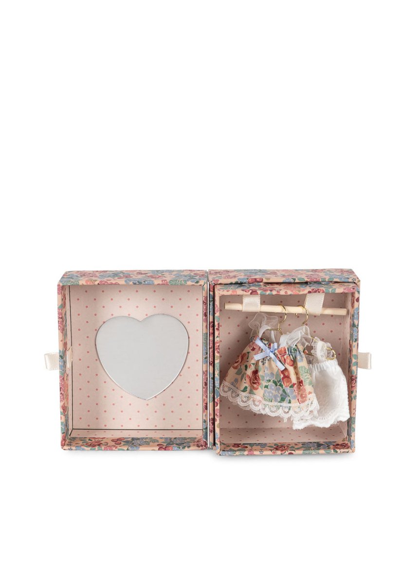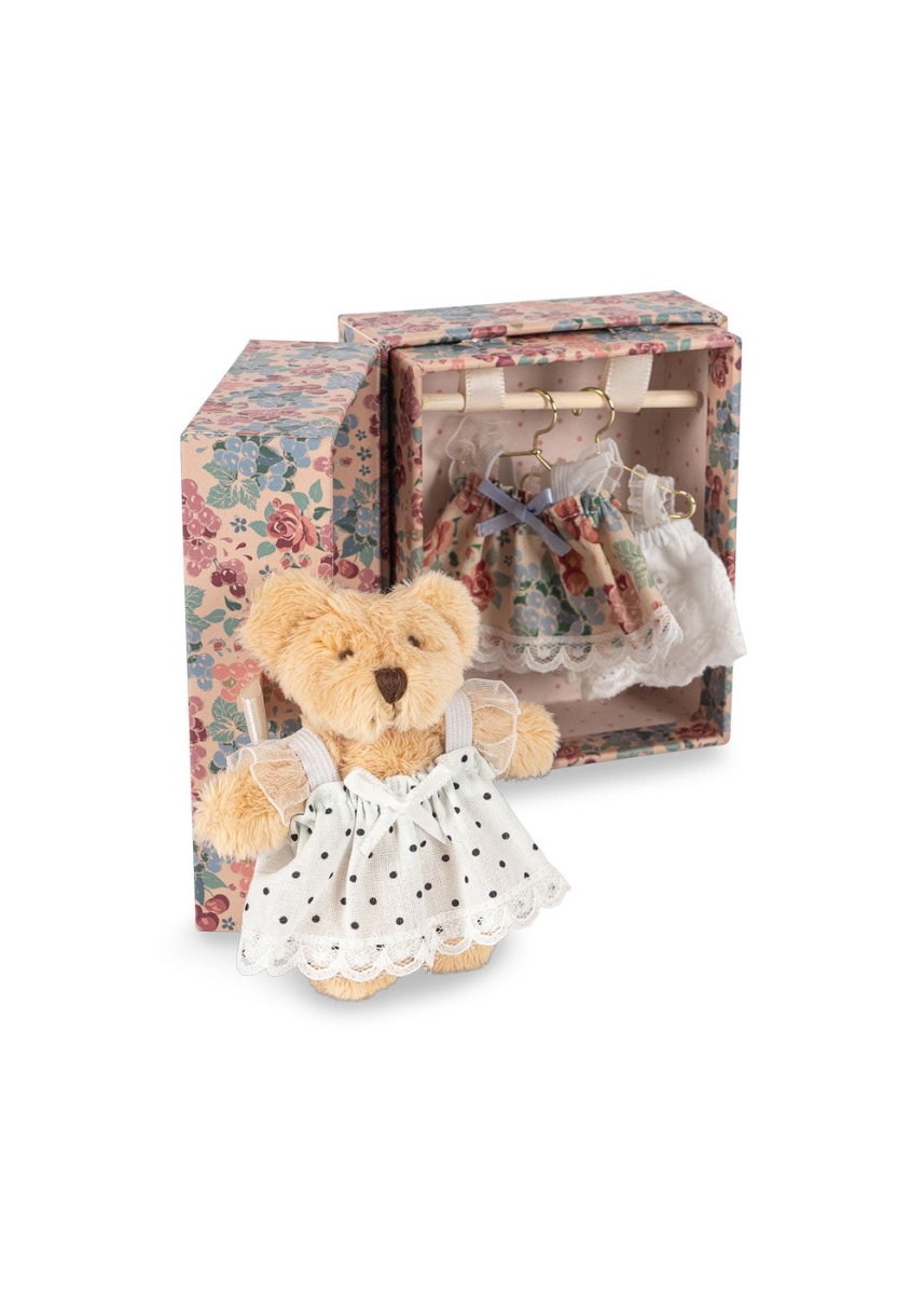De set bevat een teddybeer, een mini kast met een hartvormige spiegel en drie verschillende jurkjes om aan te trekken. Perfect voor fantasierijk rollenspel en creatief verkleden.