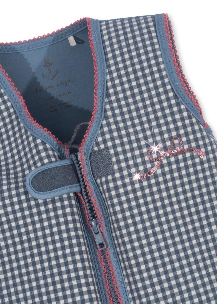 Zwemvest van gestructureerde seersucker stof met pailletten details. Een zwemvest is de perfecte metgezel als je kleintje net begint met spetteren. Het voegt natuurlijk drijfvermogen toe en helpt ze om zich op hun gemak te voelen in het water terwijl ze zelf leren zwemmen.
