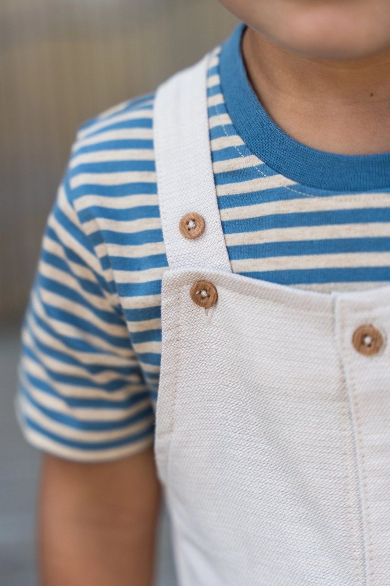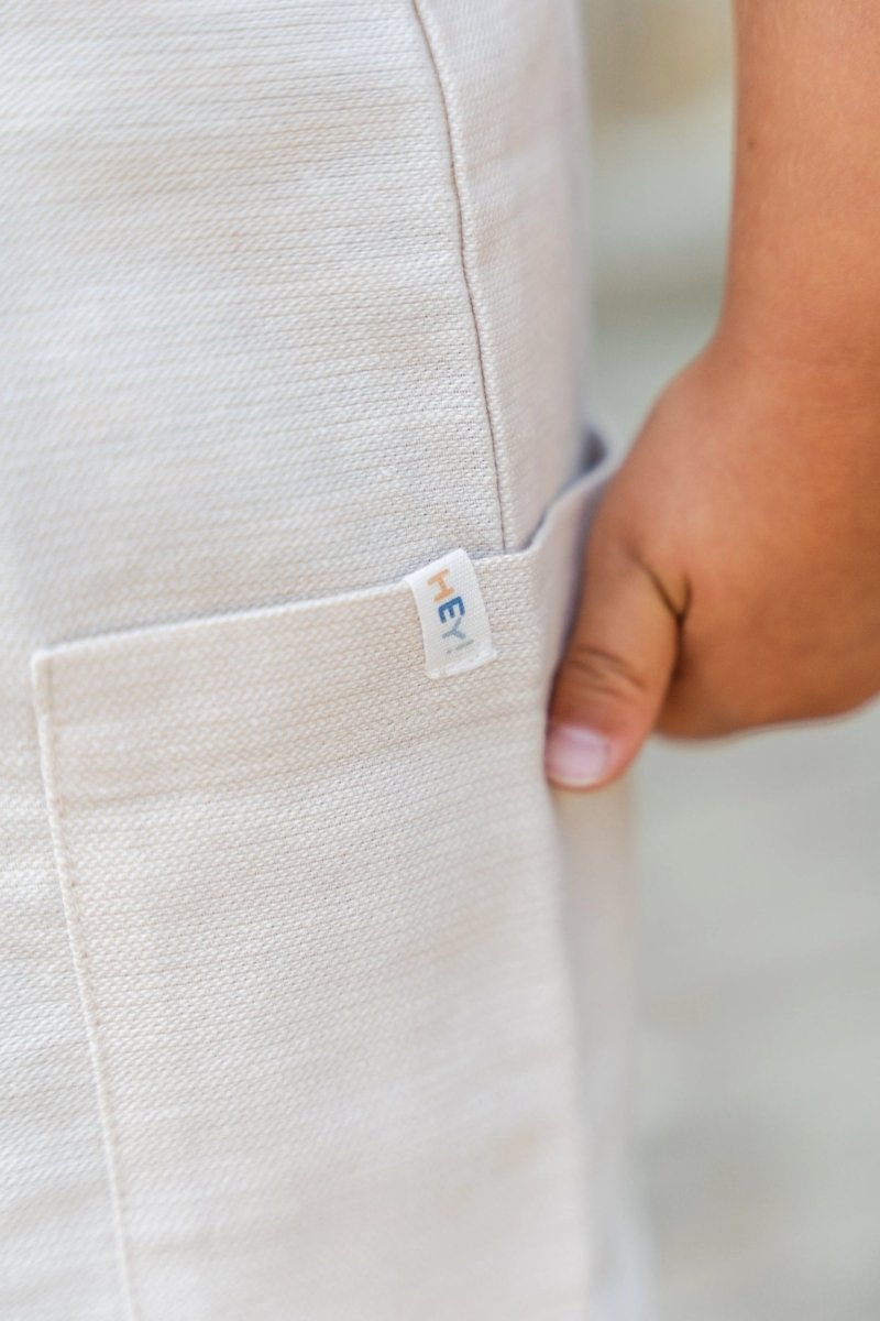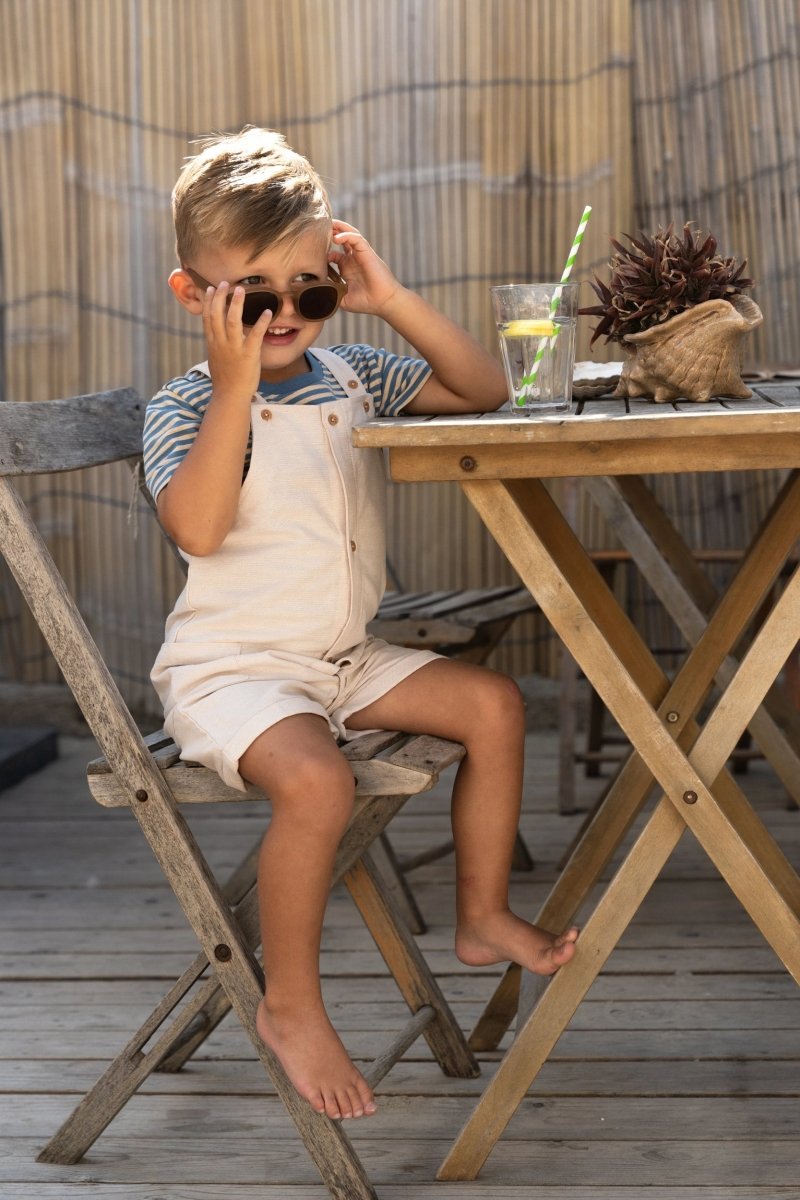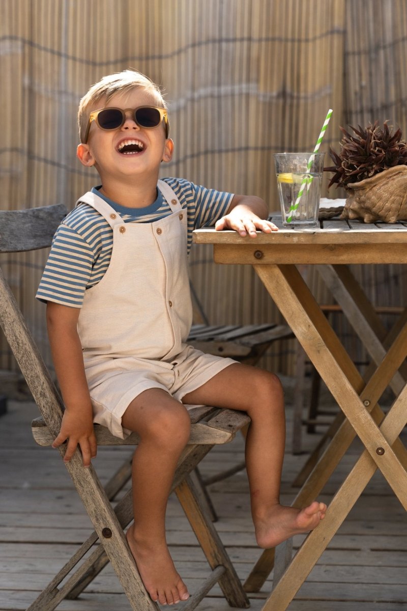 Zacht van kleur en speels van stijl: dit korte tuinpak in gemêleerde zandkleur is gemaakt van een geweven linnen-look stof die licht en luchtig aanvoelt. Ideaal voor zomerse avonturen. De verstelbare schouderbandjes met houtlook knoopjes geven het tuinpak een natuurlijke uitstraling, terwijl de zijzakken ruimte bieden voor kleine schatten onderweg. Gemaakt van 100% biologisch katoen en Oeko-Tex gecertificeerd, is het comfortabel, duurzaam en vriendelijk voor de huid.