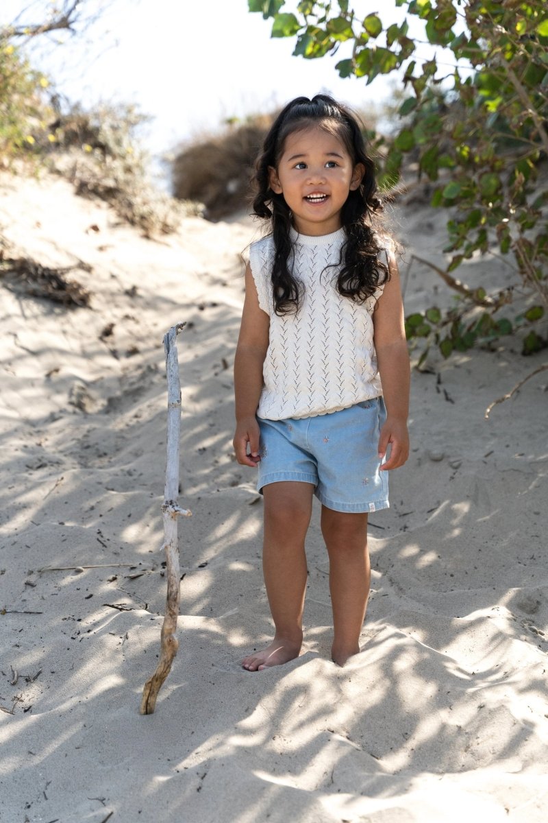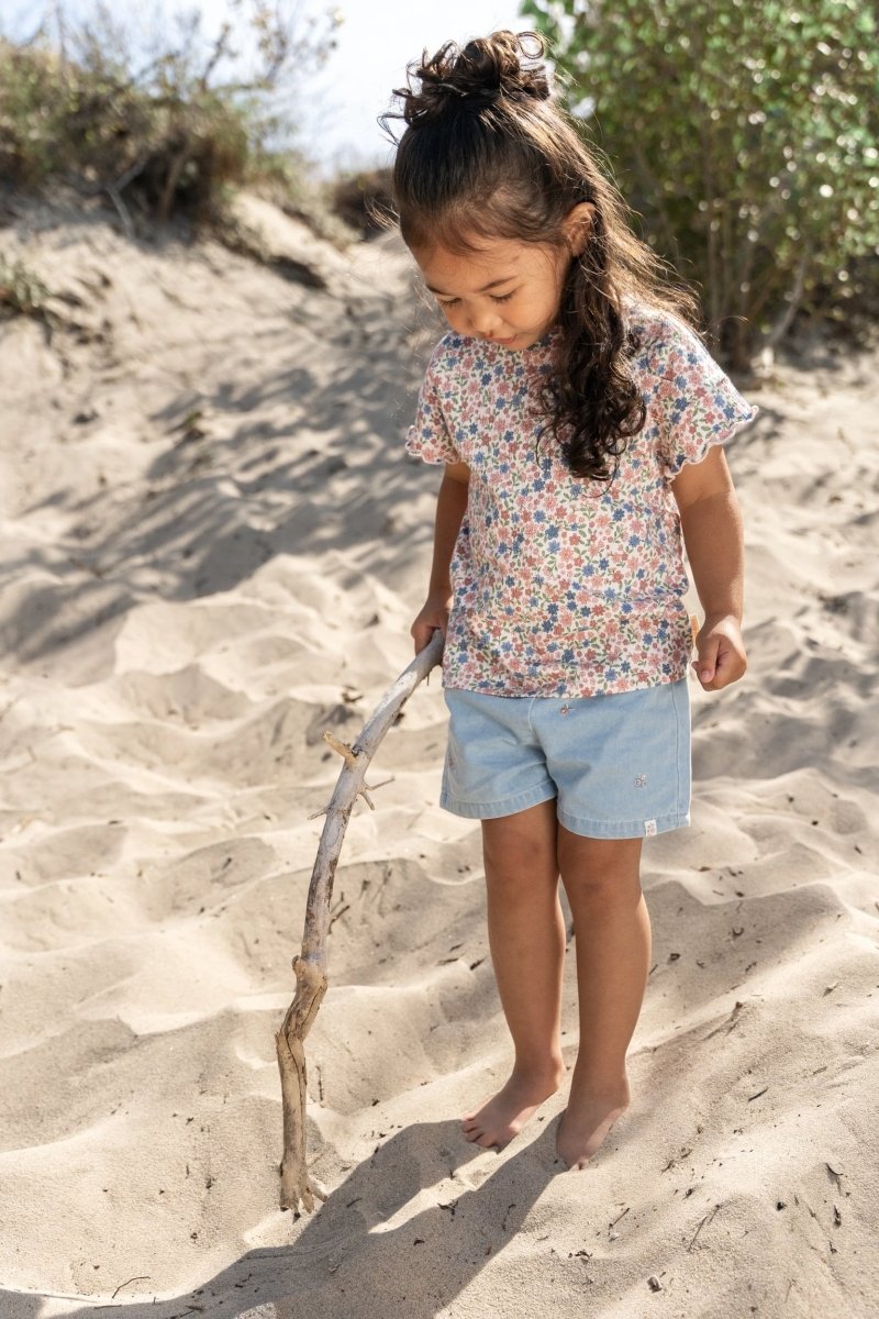 Stoer met een zachte twist. Deze korte broek in Denim is gemaakt van een lichte denimkwaliteit en versierd met fijne geborduurde bloemen. Een lief detail dat perfect past bij zonnige dagen en kleine avonturen.