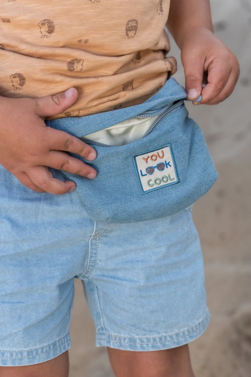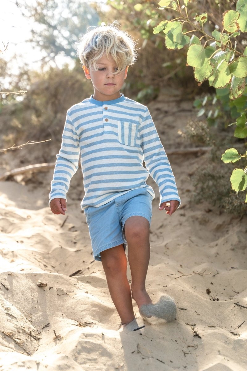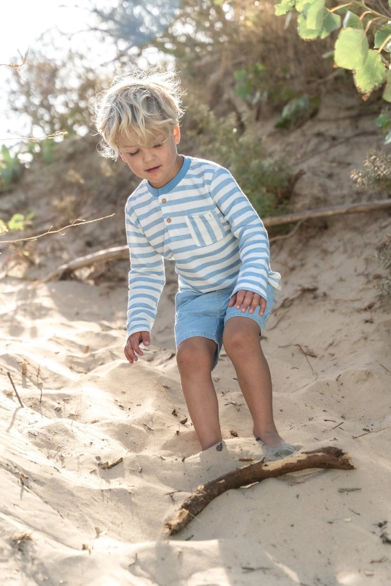 Stoer en zacht tegelijk: deze korte broek van lichte denim is ideaal voor zomerse dagen vol beweging. De elastische tailleband met koordje zorgt voor een comfortabele pasvorm die goed blijft zitten, zelfs tijdens ontdekkingsavonturen. De omslag bij de pijpen geeft een speels accent, terwijl de steekzakjes handig zijn voor gevonden schatten. Gemaakt van 75% biologisch katoen en 25% polyester, Oeko-Tex gecertificeerd, voelt de broek zacht aan en is duurzaam.