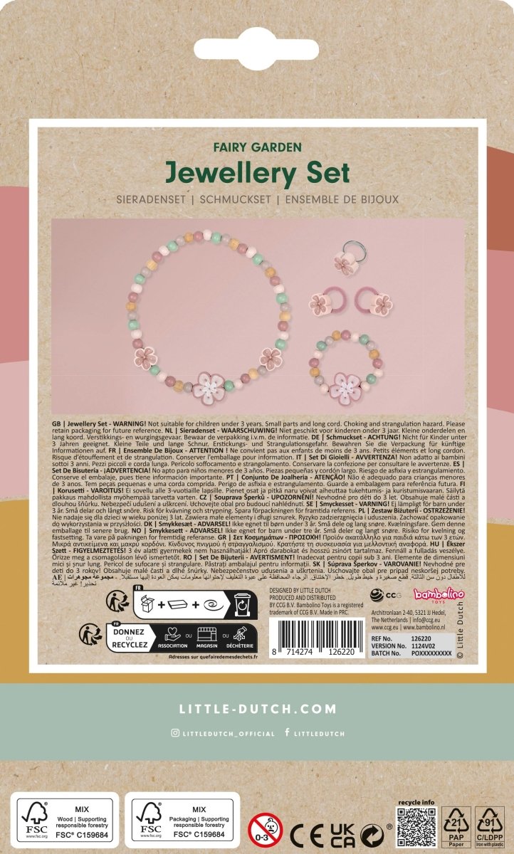 Een lieve en kleurrijke sieradenset van Little Dutch, perfect voor kleine meisjes die dol zijn op bloemen en accessoires. Ideaal als cadeau in de bijgeleverde geschenkverpakking. Inhoud van de set: 1 ketting 1 armband 2 haarclipjes met bloemenpatroon 1 extra accessoire (bloementhema) Kenmerken: Alle kralen en figuren zijn gemaakt van hout Verpakt in een mooie cadeauverpakking Stimuleert fantasie en rollenspel Geschikt voor kinderen vanaf 3 jaar