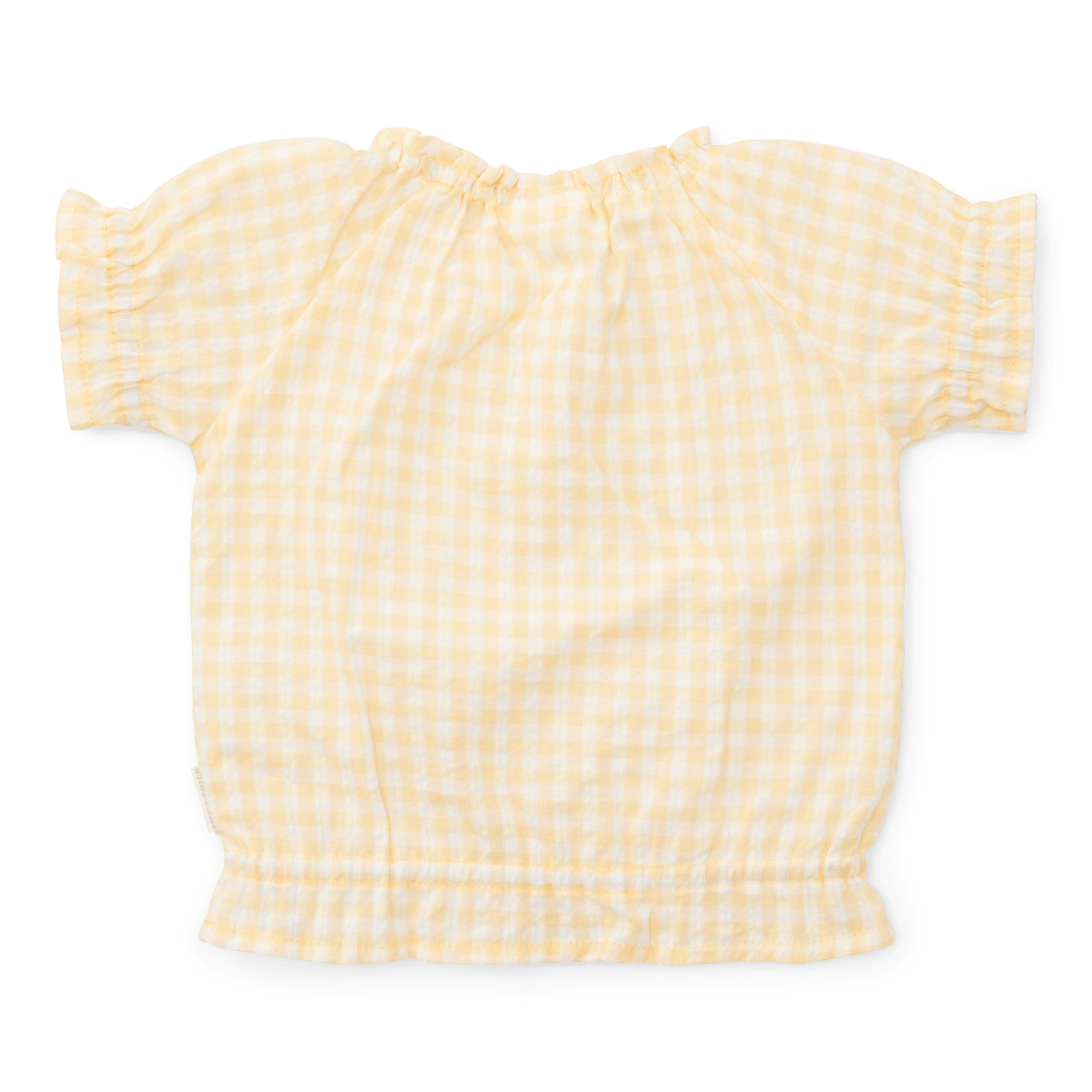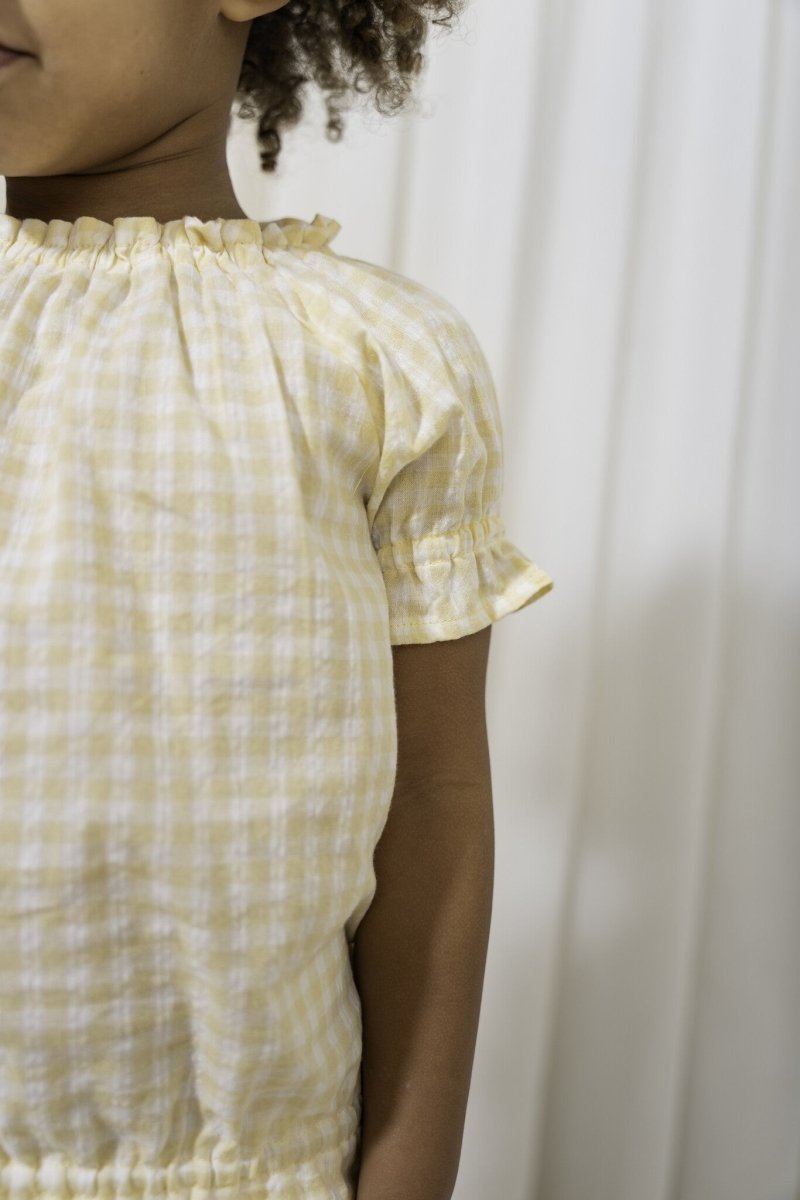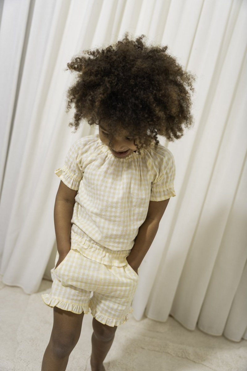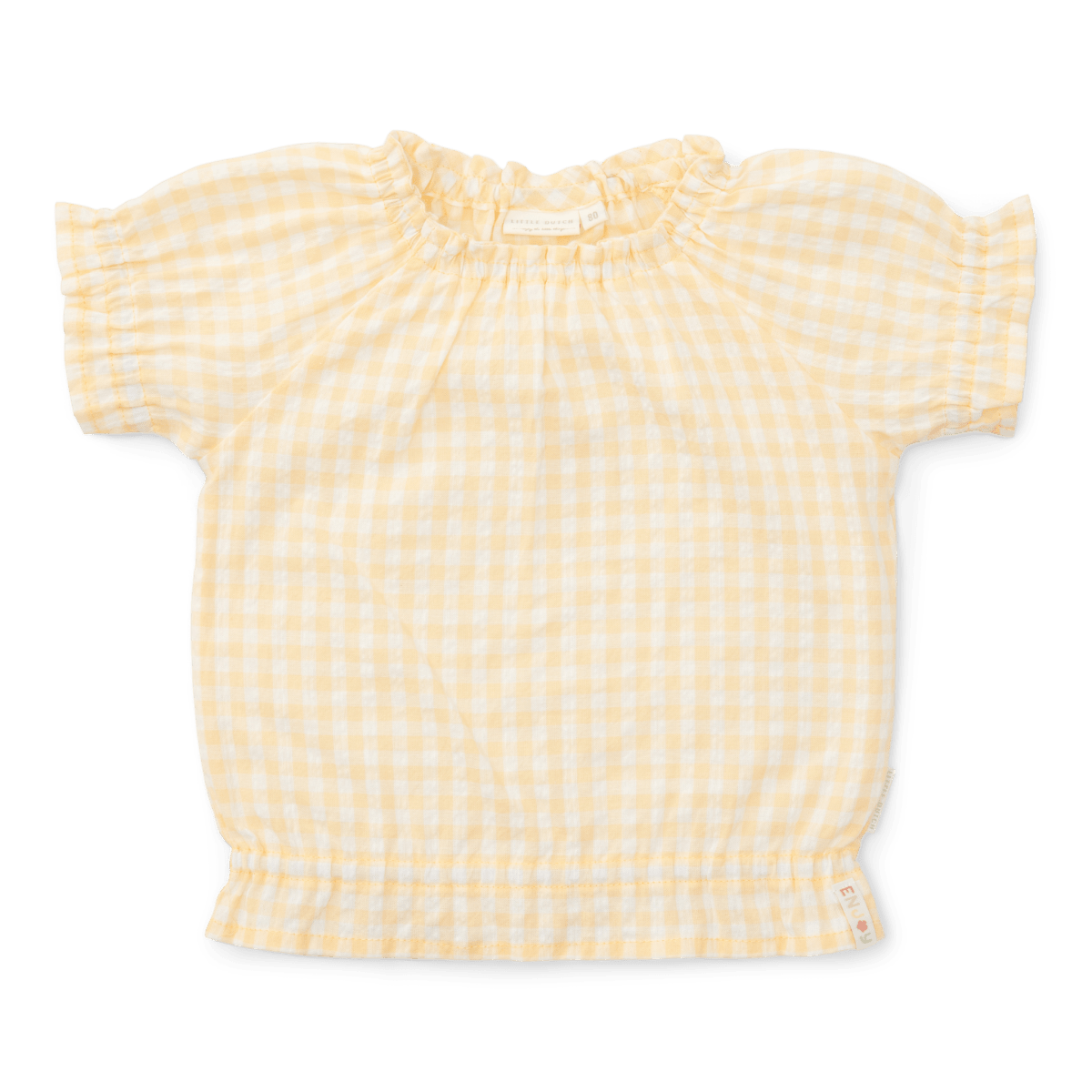 Speels en vrolijk zomers geruit! Dit geweven blousje heeft leuke korte mouwtjes en een comfortabele pasvorm. Het is gemaakt van heerlijk zacht katoen. Het zonnig geel met wit geruite printje is om vrolijk van te worden en perfect voor warme lente- en zomerdagen. Aan de blouse zitten elastische boorden, zodat deze soepel valt.
