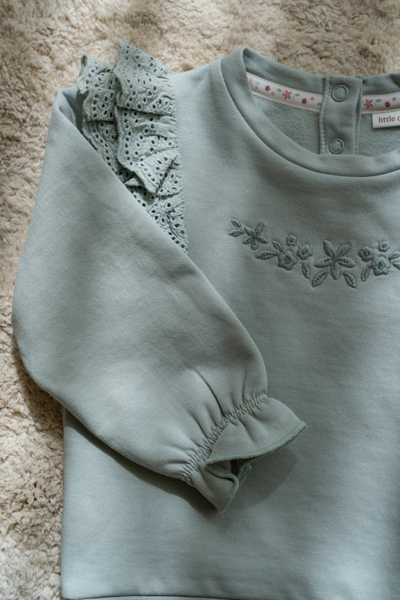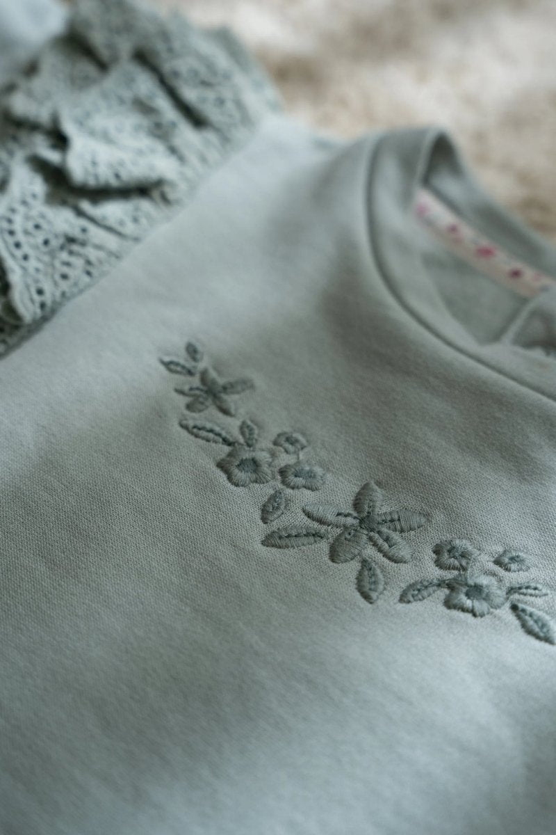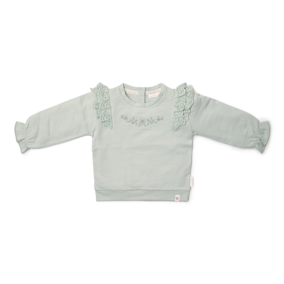 Warme en zachte sweater, ruffle aan de schouders en mouwen, tonaal bloemen borduursel, gemaakt van organisch katoen, Oekotex gecertificeerd. 100% biologisch katoen