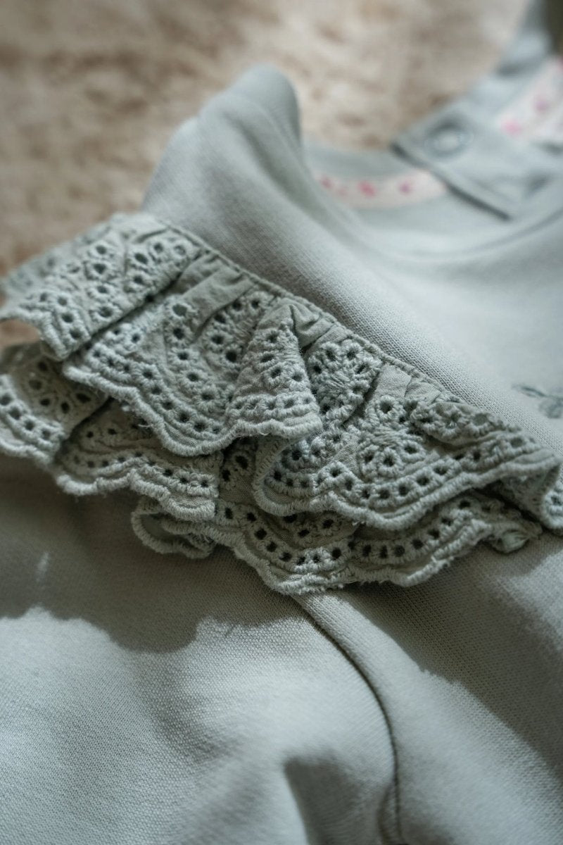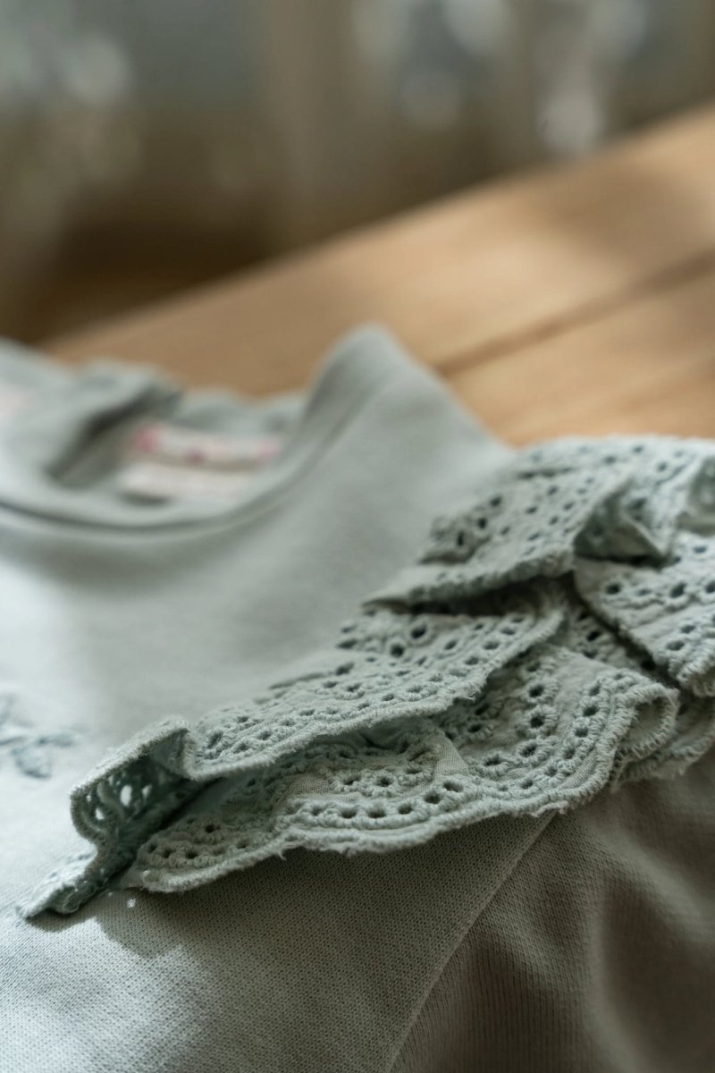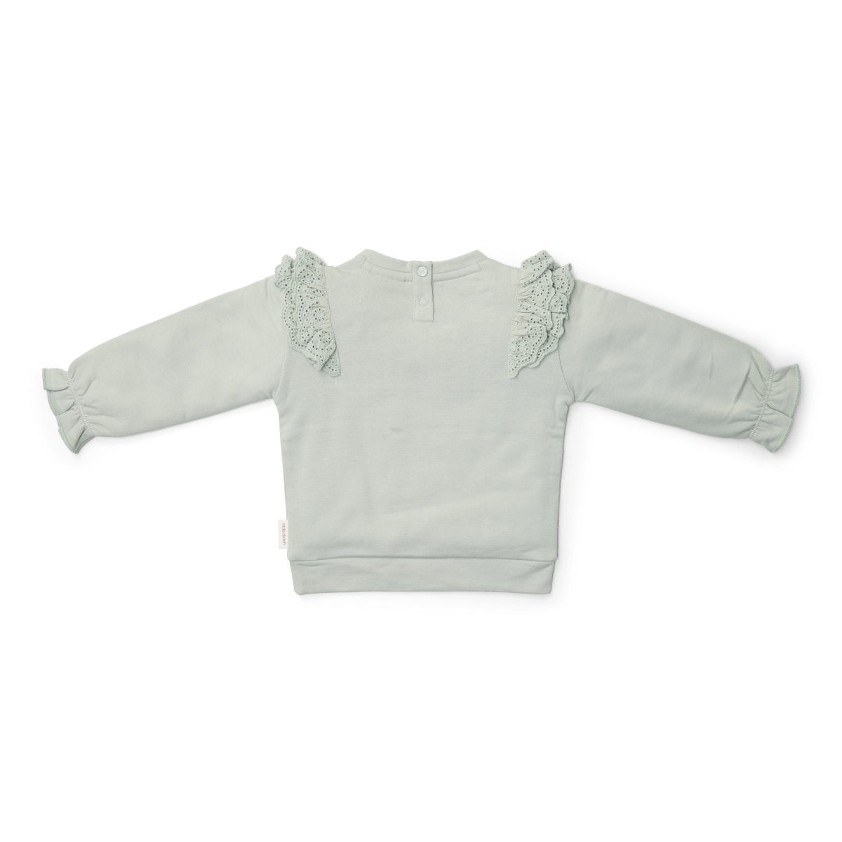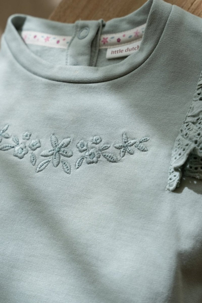 Warme en zachte sweater, ruffle aan de schouders en mouwen, tonaal bloemen borduursel, gemaakt van organisch katoen, Oekotex gecertificeerd. 100% biologisch katoen