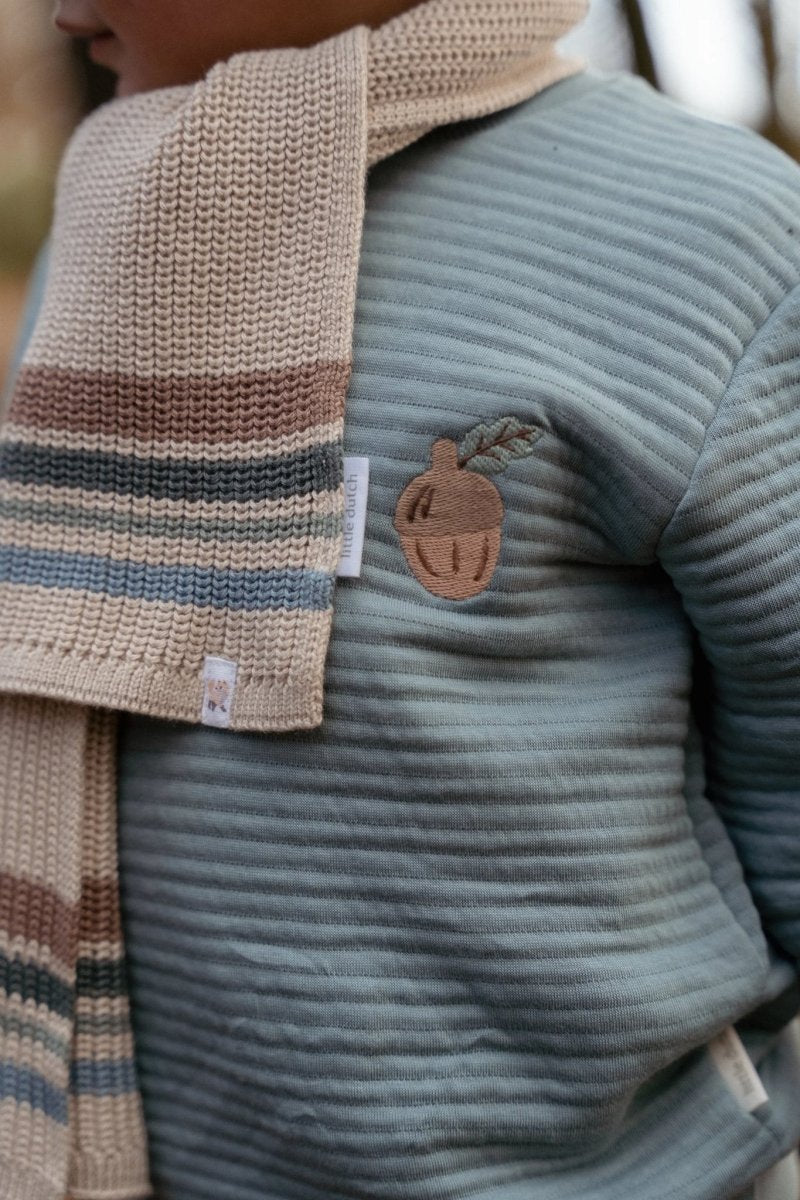 Warme stof met gestreepte structuur, Forest borduursel op de borst, deels gemaakt van biologisch katoen, Oekotex gecertificeerd. 60% biologisch katoen / 40% polyester