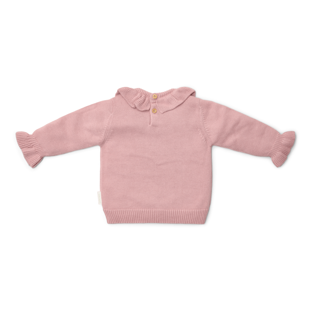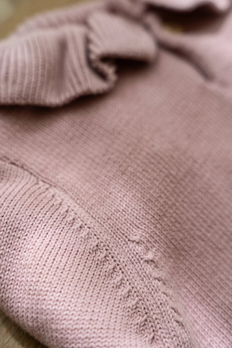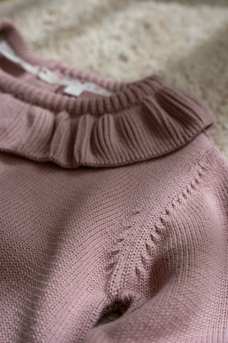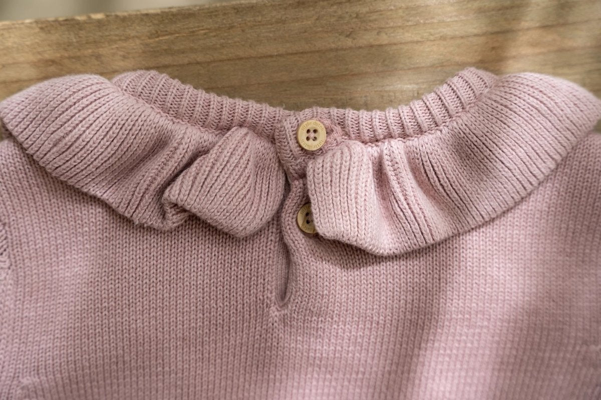 Warme gebreide trui, gemeleerde licht roze kleur, ruffle aan de nek en aan de mouwen, gemaakt van organisch katoen en Oekotex gecertificeerd. 100% biologisch katoen.