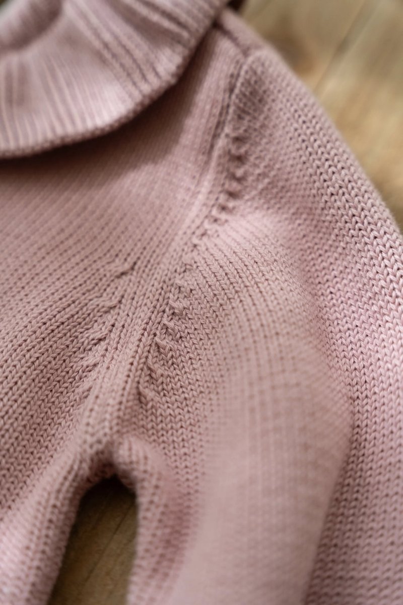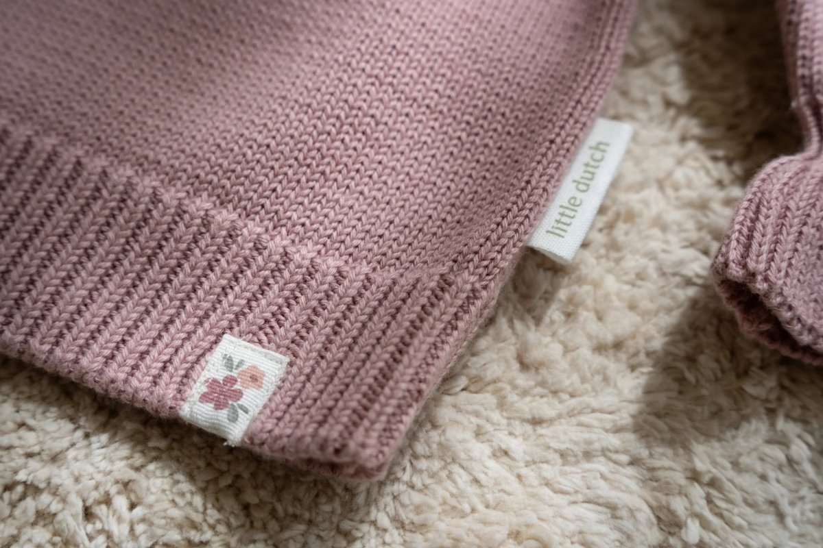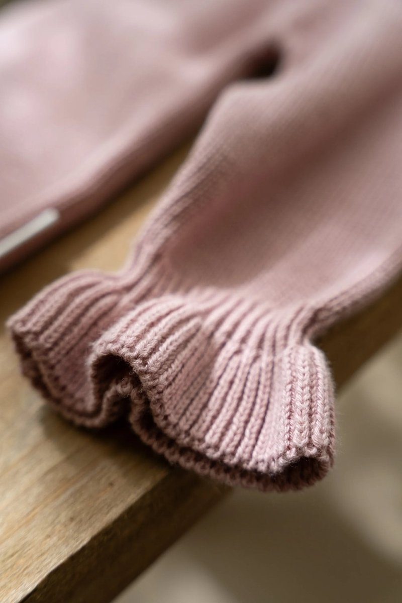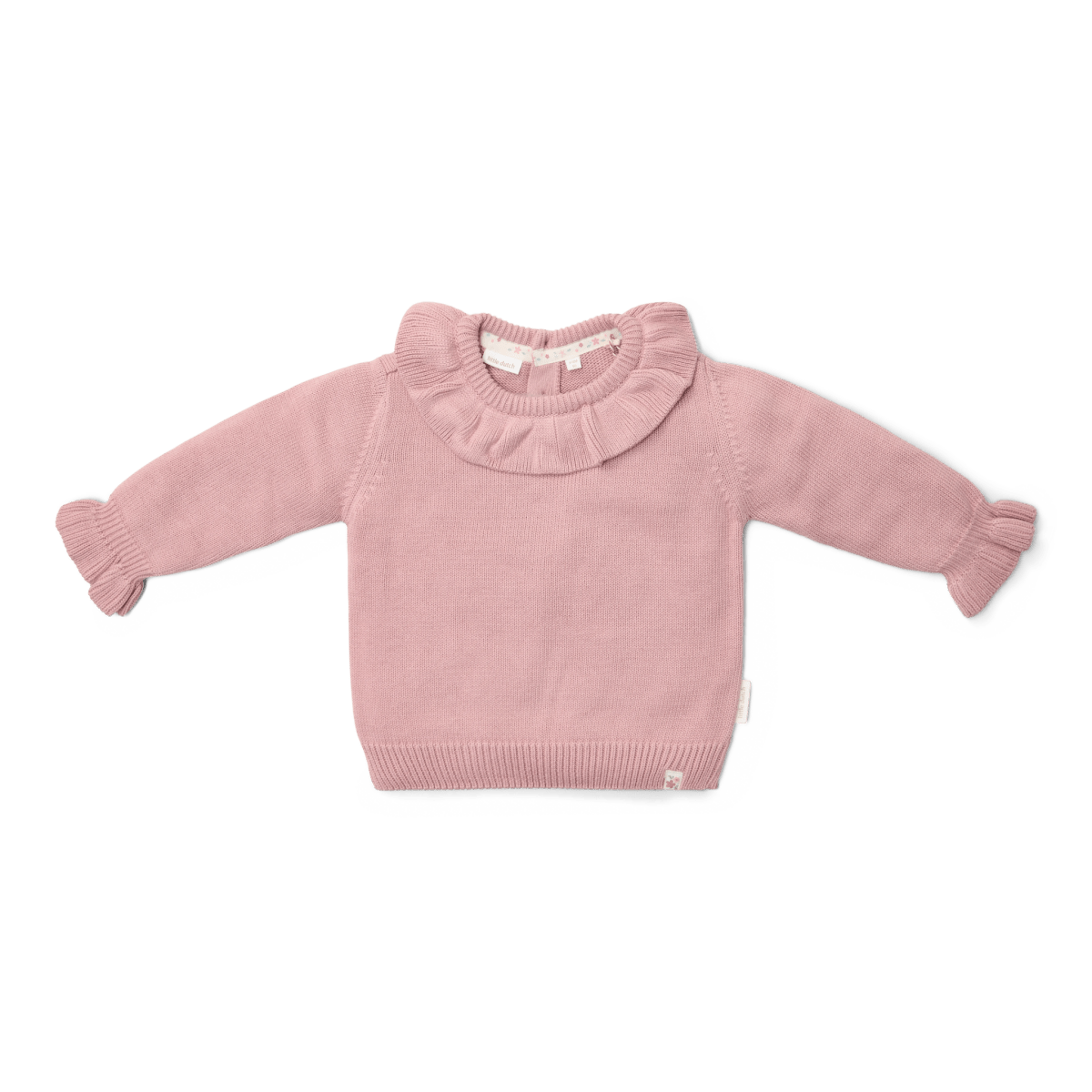 Warme gebreide trui, gemeleerde licht roze kleur, ruffle aan de nek en aan de mouwen, gemaakt van organisch katoen en Oekotex gecertificeerd. 100% biologisch katoen.