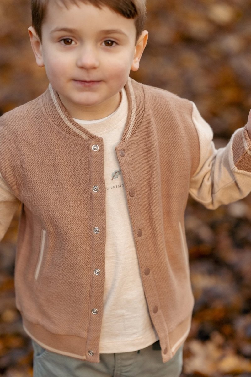 Warm vest met klein structuurtje in de stof, drukknoop sluiting midden voor, steekzakken aan de voorkant, contrast streepjes in de boorden van de mouwen, onderkant en nek, gemaakt van biologisch katoen, Oekotex gecertificeerd. 100% biologisch katoen