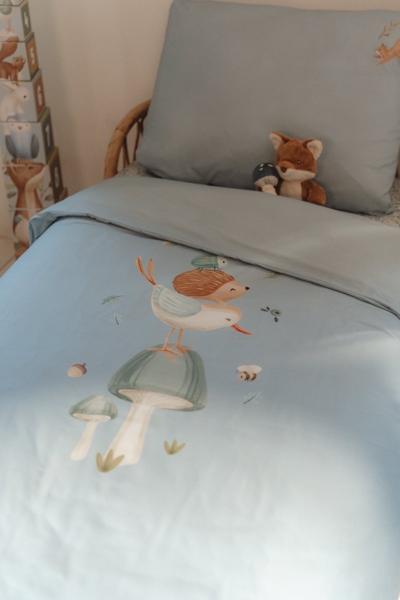 Voeg een vleugje design toe aan de kinderkamer met een prachtig opgemaakt bed. Met dit dekbedovertrek voor een peuterbed zal je kleintje heerlijk wegdromen naar avontuur. Het collectie Forest Friends inspireert de mooiste dromen over een avontuurlijk bos waarin een vogel, egeltje en kevertje balanceren op een paddenstoel. Het zachte dekbedovertrek is gemaakt van 100% biologisch in een effen Denim Blue kleur versierd met een speels tafereel uit het bos. Zowel de kussensloop als het dekbedovertrek zijn comfortabel, mooi afgewerkt en hebben een goed ademend vermogen. Het formaat van het dekbedovertrek is 120 x 150 cm en de kussensloop is 40 x 60 cm.