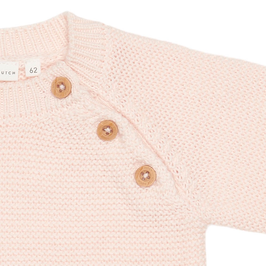 Little Dutch ontwerpt graag kledingstukken die comfort en gemak brengen. Maak je kleintje in een handomdraai klaar voor de dag met dit gebreide boxpak. Het is praktisch en zit prettig tijdens het spelen, slapen en kruipen. Dit heerlijke pak heeft een mooie roze kleur en is voorzien van hout-look knopen en een klein zakje.
