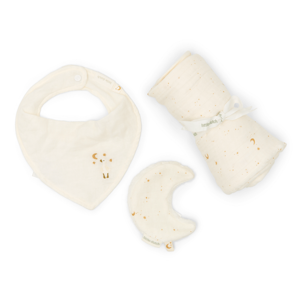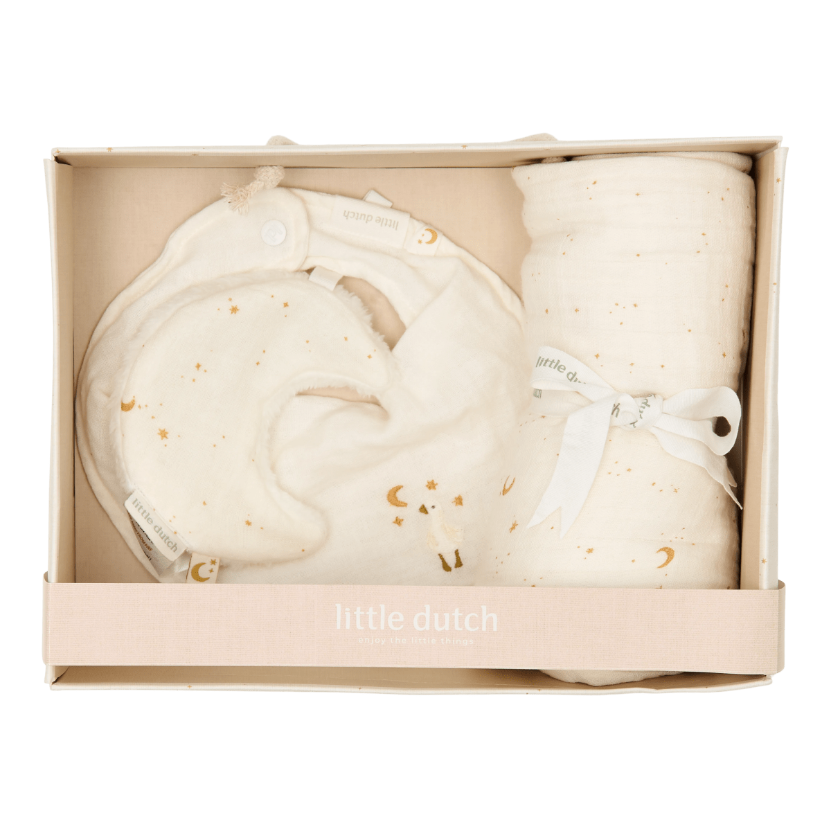 Geef het perfecte cadeau met deze luxe gift box! De set bevat 3 must-have items: een hydrofiele doek en speendoekje met de schattige Moon & Stars print, plus een bandana in een rustige Soft White kleur met schattig borduursel. Gemaakt van muslin, pre-washed en crinkled, zijn deze doekjes en bandana heerlijk zacht en super absorberend. De bijpassende box is niet alleen perfect voor het cadeau, maar ook ideaal om herinneringen van je kleintje in te bewaren (want we weten allemaal dat die eerste slofjes ergens bewaard moeten worden).