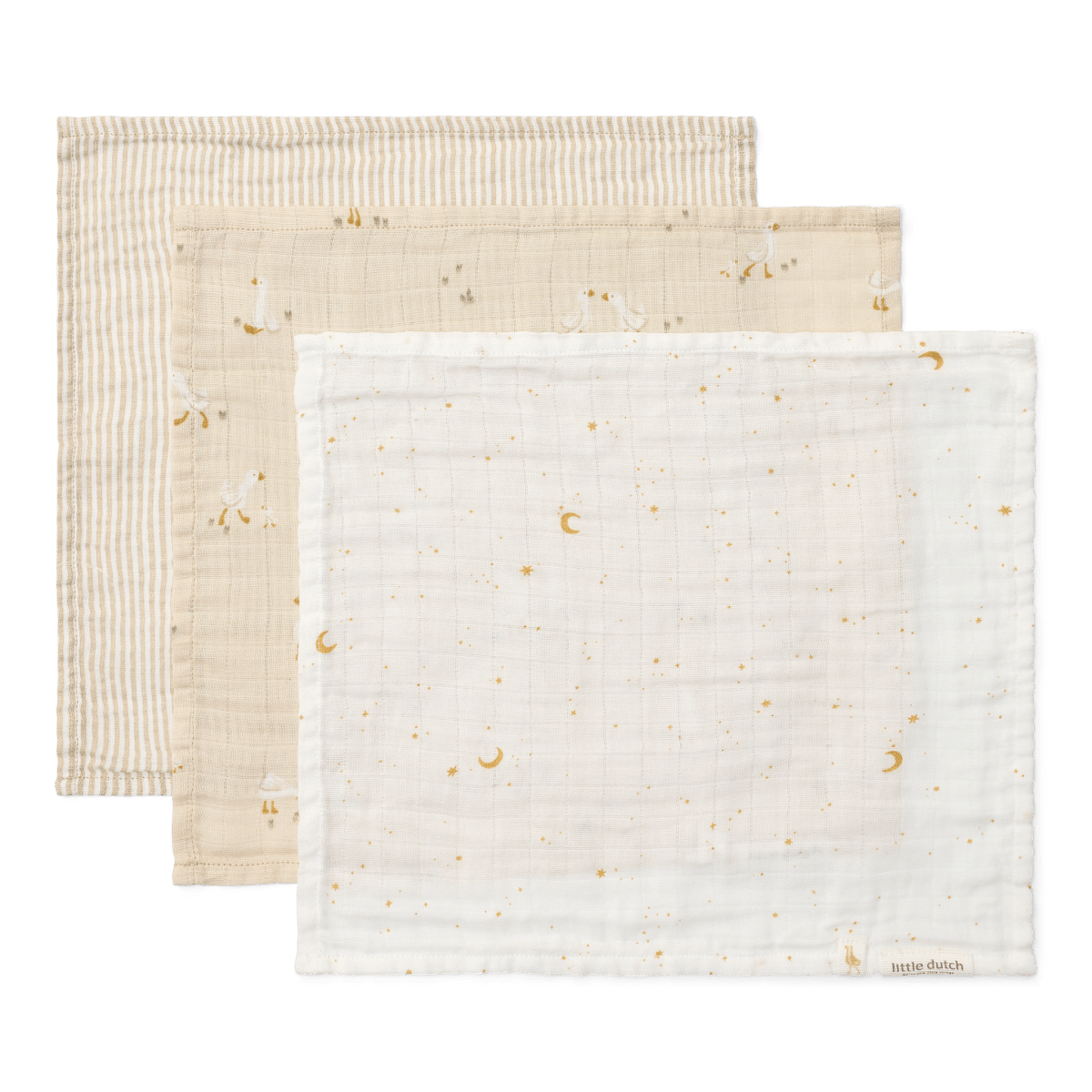 Veeg voedingsrestjes en snottebellen weg met deze ultra-zachte 100% biologische katoenen hydrofiele doekjes. Ademend, veelzijdig en altijd klaar voor actie – deze set van 3 monddoekjes is je beste vriend in de babyverzorging. Of je nu voeding, kwijl of gemorste melk opruimt, ze zijn perfect voor thuis of onderweg. De set combineert schattige printjes met een effen kleur die bij elke gelegenheid past.