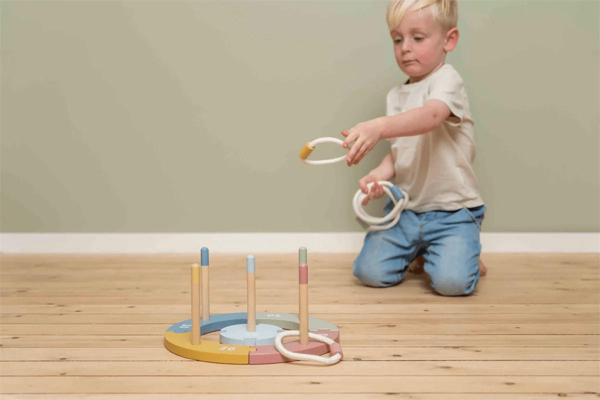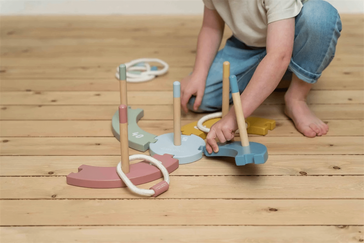 Door dit klassieke ringgooispel te spelen, ontwikkel je de hand-oogcoördinatie, het inschatten van afstanden en nauwkeurig richten van je kleintje. De set wordt geleverd met 5 houten doelframes in verschillende kleuren en met verschillende punten. Elk heeft een stokje om één van de 5 katoenen touwringen naar te gooien. Laat de set niet buiten of in de regen liggen als je klaar bent met spelen, maar bewaar het op een droge plek.