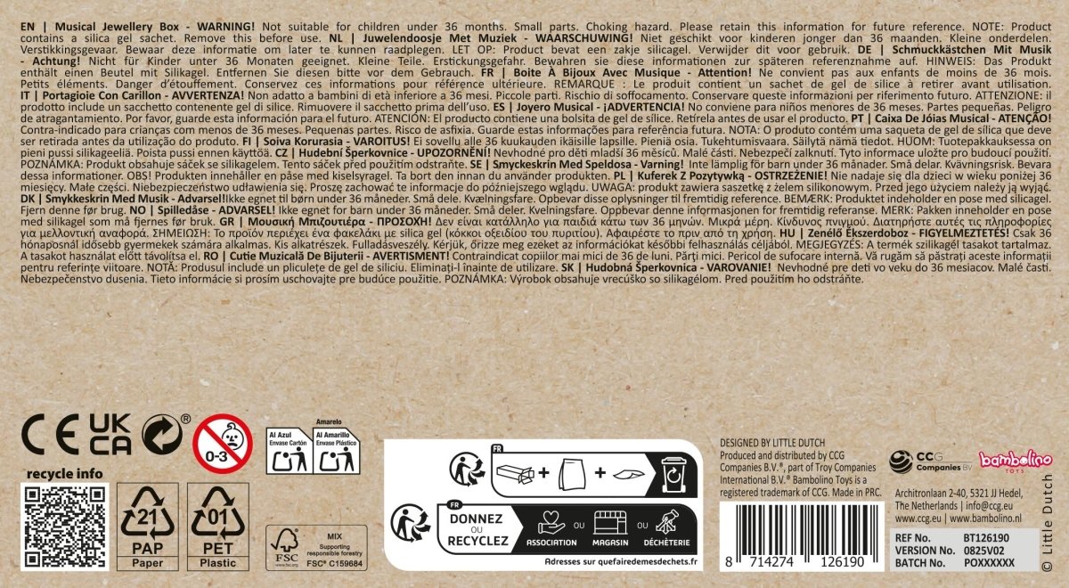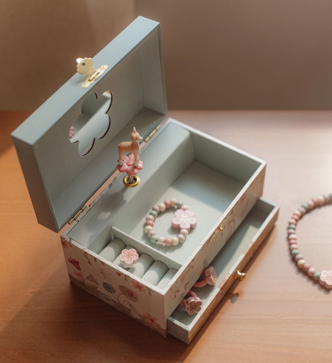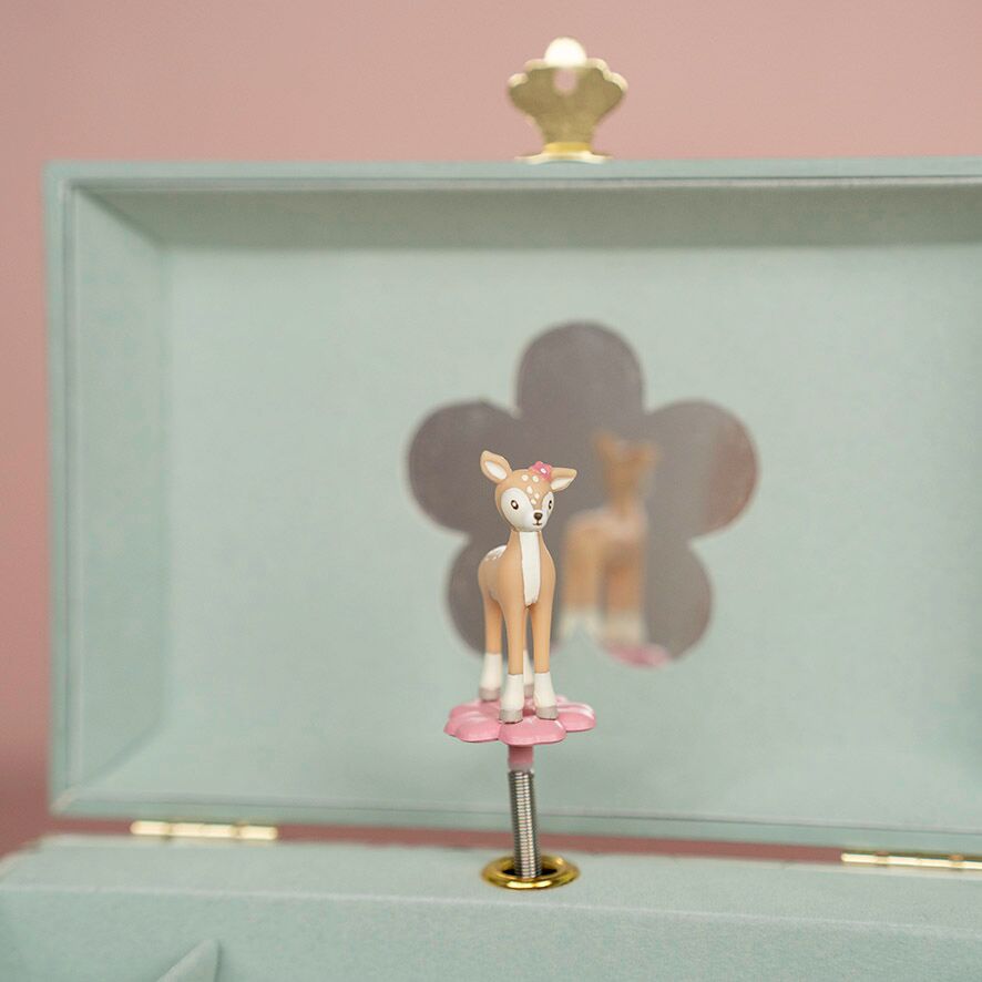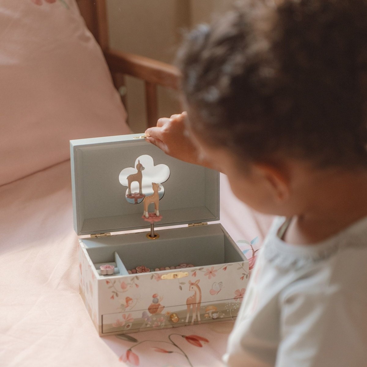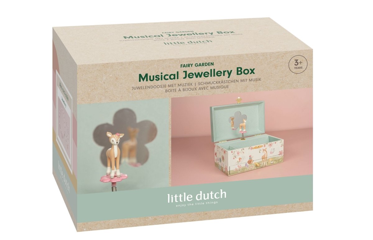 Stap binnen in een wereld vol betovering met het Little Dutch juwelenkistje met muziek. Dit kleurrijke kistje biedt voldoende ruimte voor de mooiste sieraden en schatten. Wanneer het kistje opengaat, speelt het muziekje terwijl een hertje voor de spiegel danst. Werkt zonder batterijen, het muziek mechanisme wordt met de sleutel op de achterzijde van het kistje opgedraaid. Een waardevol artikel om te koesteren, dat de zintuigen van je kleintje stimuleert en inspireert.