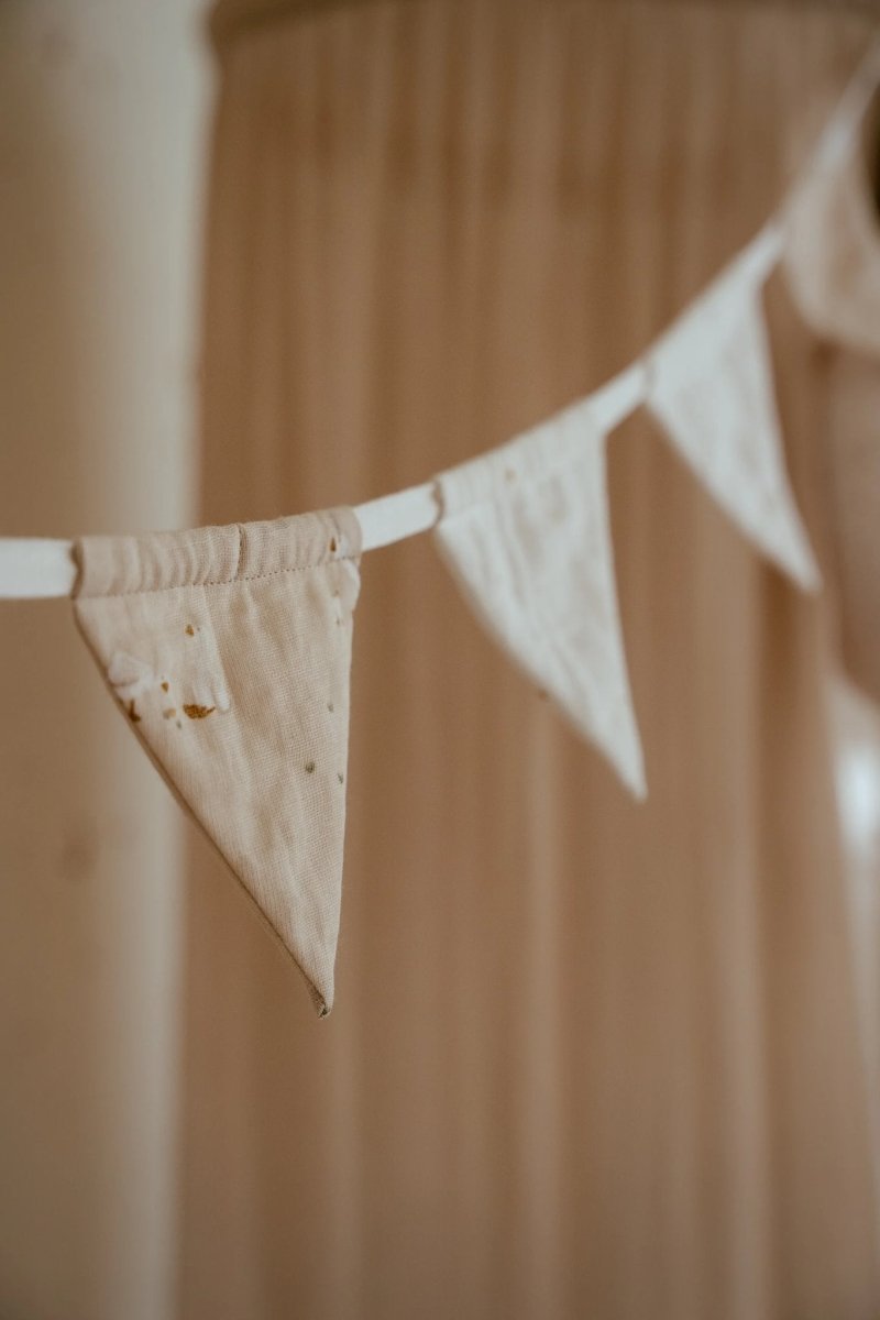 Vrolijk de babykamer op met deze mooie slinger met vlaggetjes. Wie zegt dat slingers alleen voor feestjes zijn?! Ze fleuren een kamer meteen op. Aan de muur, om de klamboe, op een boekenplank of ter versiering van een speeltent. Ga creatief aan de slag met deze charmante stoffen slinger in zachte kleur en met lieve Little Goose print.