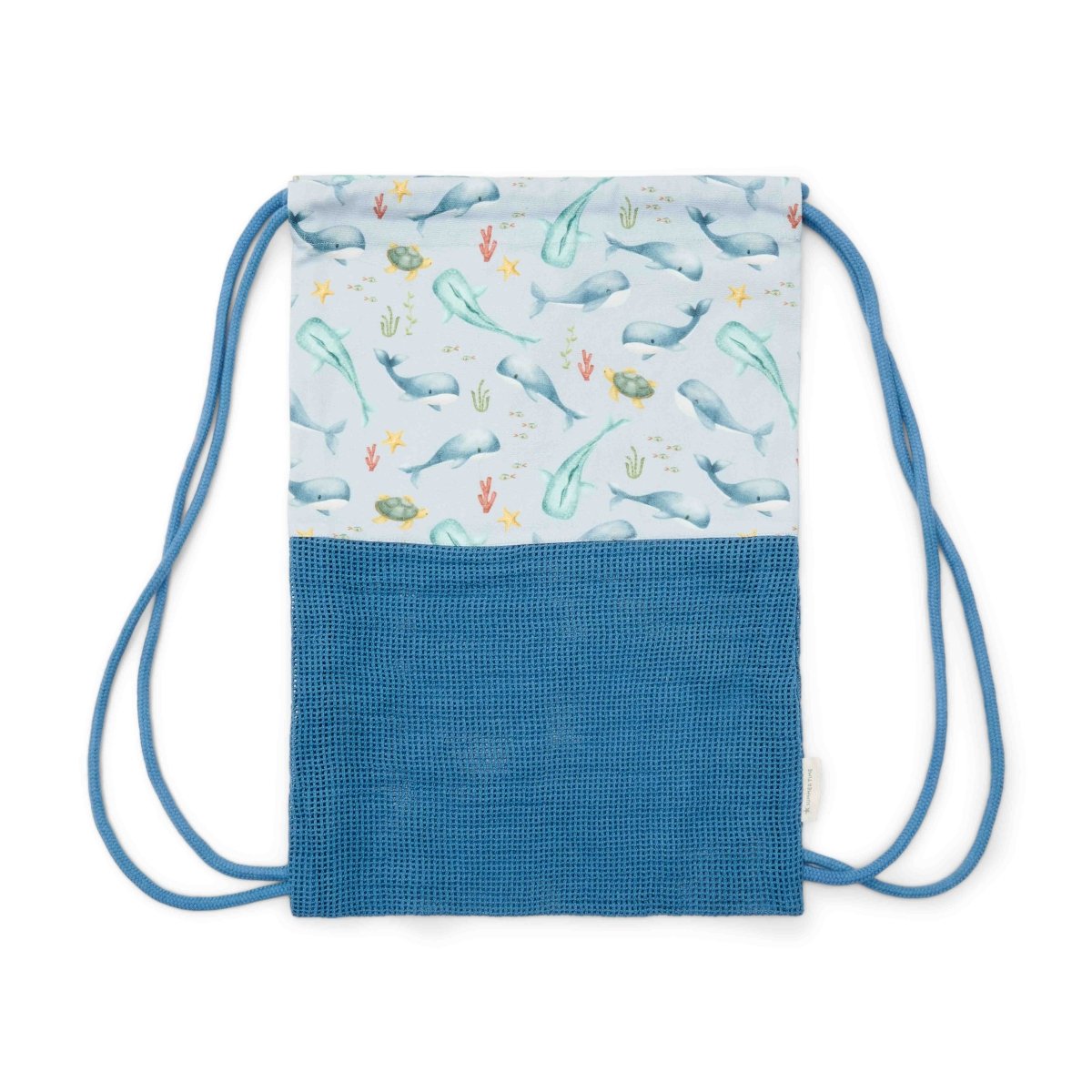 Zelf je zwemkleren dragen is nog nooit zo leuk geweest met deze strandtas! Perfect om je zwemkleding, hoedje en schoentjes mee te nemen, deze tas is gemaakt van 100% organic katoen. De onderkant van de tas is van netstof, zodat je natte zwemkleding snel opdroogt en mama geen zand in de auto heeft. Een praktische en duurzame keuze voor een dagje strand of zwembad!