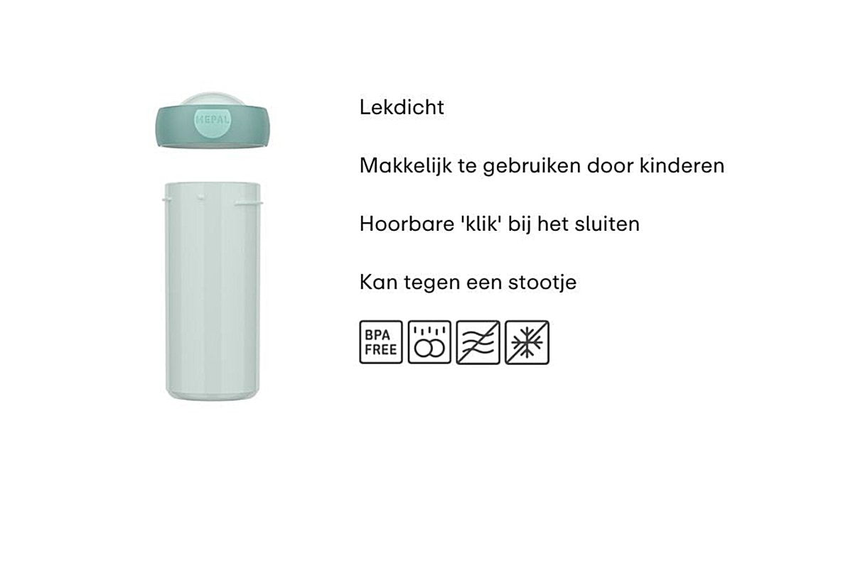 De ideale schoolbeker? Een lekvrije natuurlijk! De speciale afdichtring in de schroefdeksel zorgt voor een hermetische sluiting. De drinkbeker is makkelijk door kinderhandjes te openen en te sluiten en kan tegen een stootje. Neem de beker mee tijdens een dagje uit, naar de speeltuin, naar zwemles of natuurlijk gewoon mee naar school. Waar je ook naar toe gaat, de schoolbeker van Mepal gaat met je mee! De beker heeft een inhoud van 300 ml en mag na gebruik gewoon in de vaatwasser.