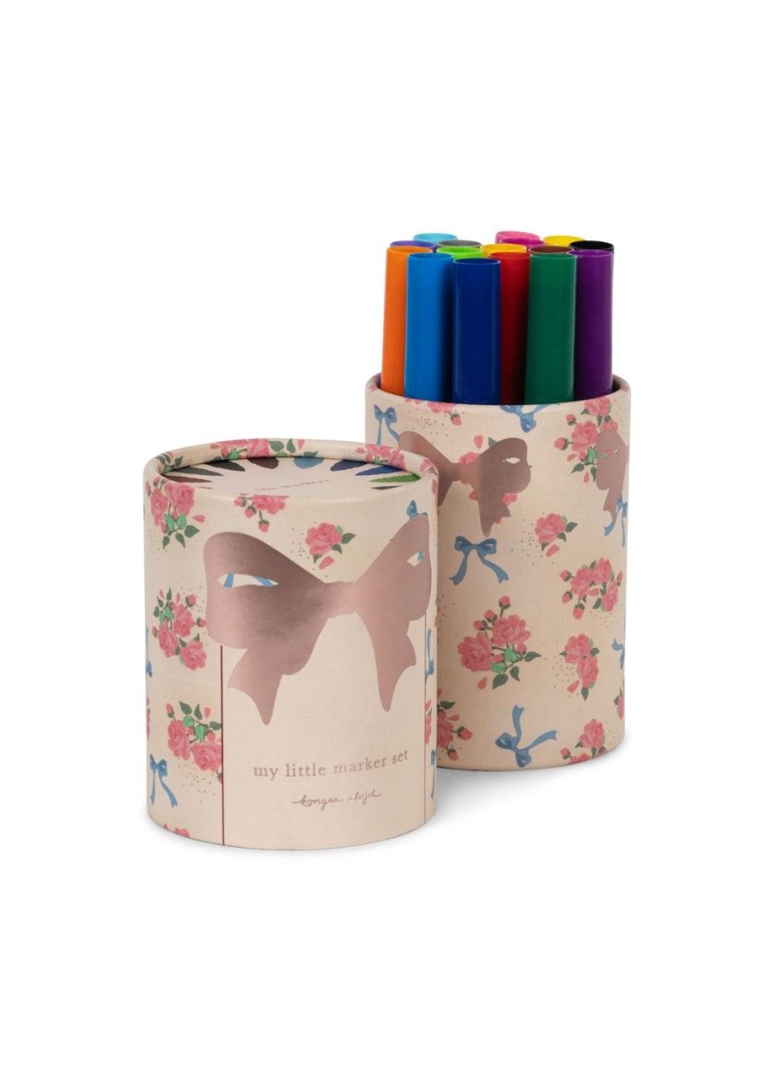 De Mijn Eerste Marker Set Flower is een vrolijke set met 16 watergedragen stiften, perfect voor creatieve momenten thuis of op school. De stiften worden geleverd in een schattige koker die ook gebruikt kan worden als decoratieve houder op een bureau of tafel.