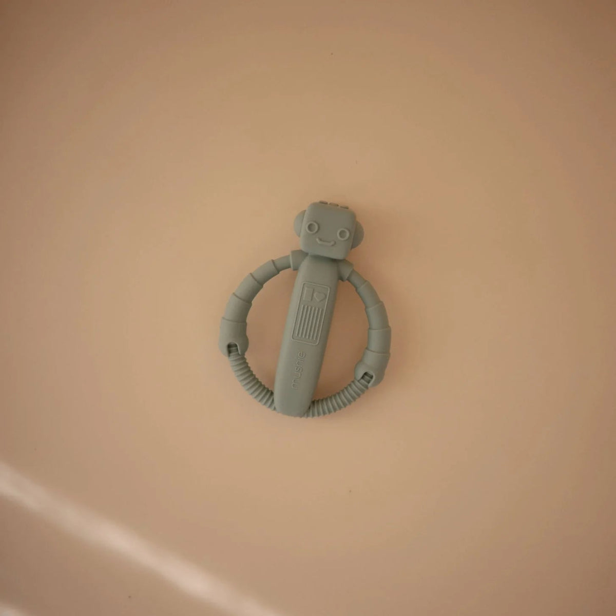 Geïnspireerd door technologie en ontworpen met functionaliteit en comfort in het achterhoofd, heeft onze siliconen Robot rammelaar een speelse robotvorm en een ingebouwde rammelaar. Het vrolijke geluid stimuleert de auditieve zintuigen van baby voor extra geruststelling.