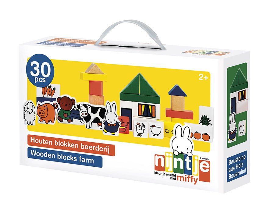 Met deze nijntje houten blokkenset boerderij kunnen kindjes eindeloos bouwen en dat is nou juist de bedoeling. De set bestaat uit 28 houten blokjes in vrolijke kleuren en hiermee bouw je een boerderij, compleet met nijntje, boris en allerlei dieren. Na het spelen kunnen de blokjes weer opgeborgen worden in de stevige kartonnen koffer met handvat. Ideaal geschenk als eerste blokkenset of als uitbreiding op de houten blokkenton van 50 blokjes.