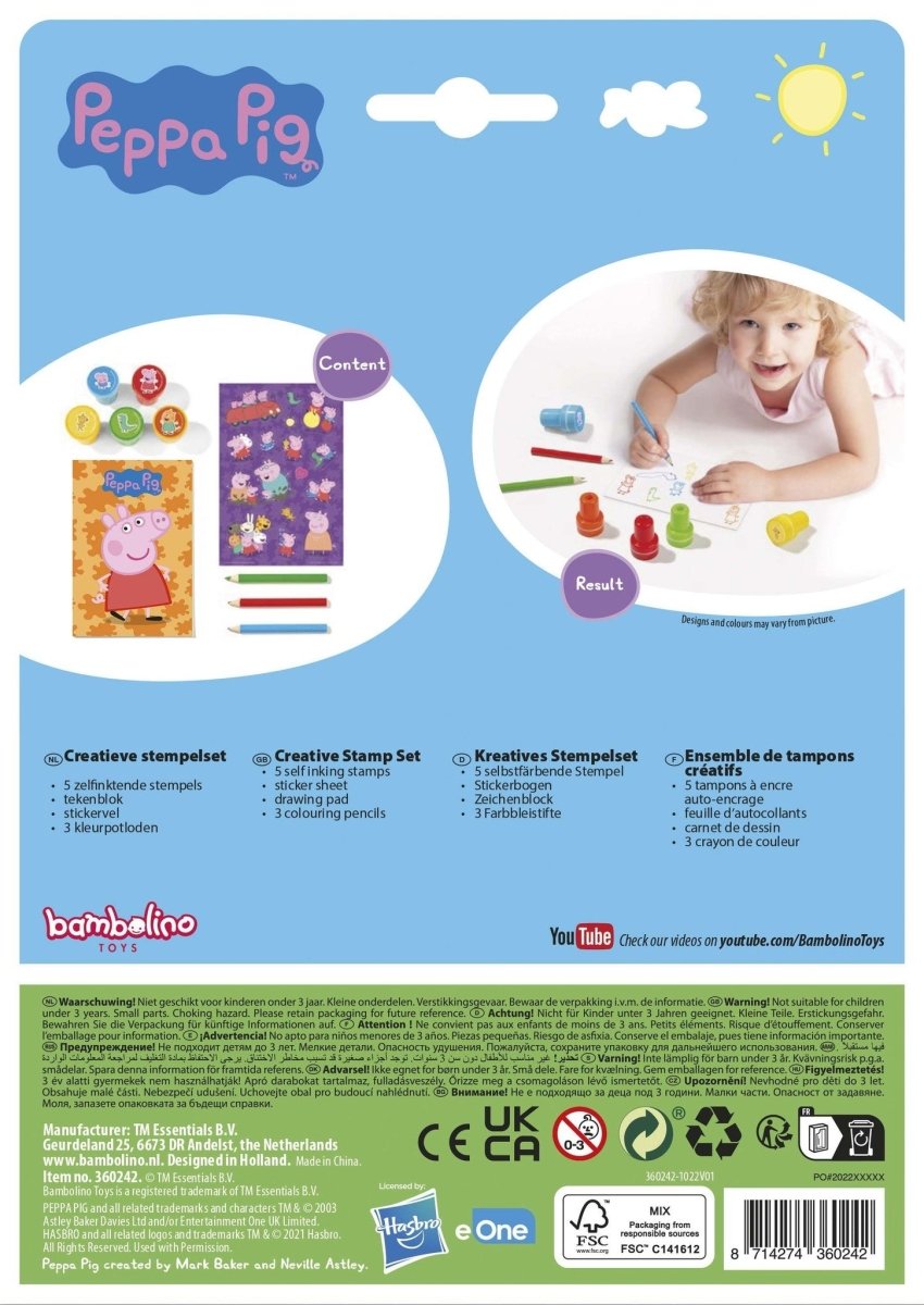 Heel veel stempel- en tekenplezier met de Peppa Pig stempelset. Deze set bevat stickers, potloden, een notitieblokje en zelfinktende stempels met de leukste afbeeldingen van Peppa, George en veel andere vriendjes. Elke zelfinktende stempel is voorzien van een dopje zodat de inkt niet uitdroogt. Omdat een apart stempelkussen hierdoor niet nodig is en de stempels gemakkelijk vast te houden zijn, behoort geknoei tot het verleden en kan het serieuze stempelwerk beginnen!