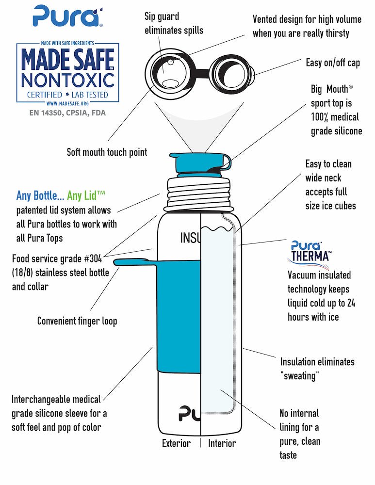 De Pura RVS thermosfles is de enige 100% plasticvrije tuitfles ter wereld én MadeSafe®-gecertificeerd. Gemaakt van hoogwaardig RVS en medische siliconen, vrij van BPA, BPS, PVC, ftalaten en lood. Deze award-winning fles is daarmee volledig veilig voor jou, je gezin én het milieu.