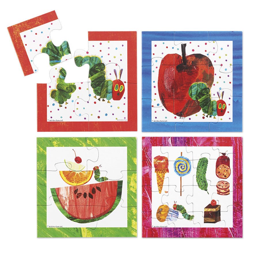 Deze set bestaat uit 4 puzzels met bontgekleurde afbeeldingen uit het boek Rupsje Nooitgenoeg van Eric Carle. Hierin gaat het rupsje op zoek naar heerlijke hapjes die je ook terug ziet op de puzzels. De jongste puzzelaars beginnen met een puzzel van 4 stukken en wie toe is aan de volgende uitdaging kan een puzzel van 6, 9 of 16 stukken leggen.