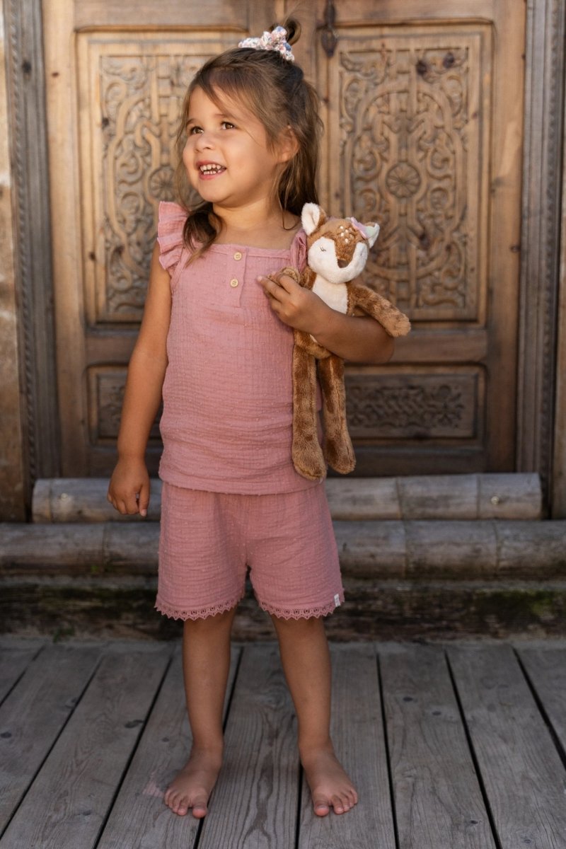 De hout-look knoopjes zorgen ervoor dat aan- en uitkleden makkelijk én stijlvol gaat. Gemaakt van biologisch katoen en Oeko-Tex gecertificeerd – voor een veilige en verantwoorde keuze, elke dag weer. Een zomers item dat moeiteloos combineert met een rokje of short, voor eindeloze dagen vol kleine ontdekkingen.