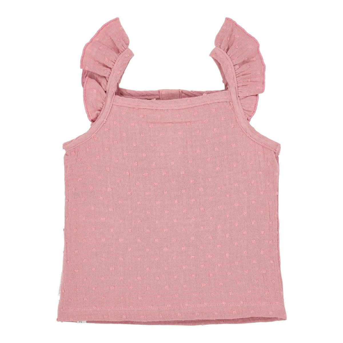 Licht, luchtig en vol lieve details. Dit singlet in Pink Blush is gemaakt van een fijne geweven stof met een subtiel stipje dat in de stof is verweven. De ruches op de schouders geven het singlet een speels en zomers karakter, perfect voor warme dagen.
