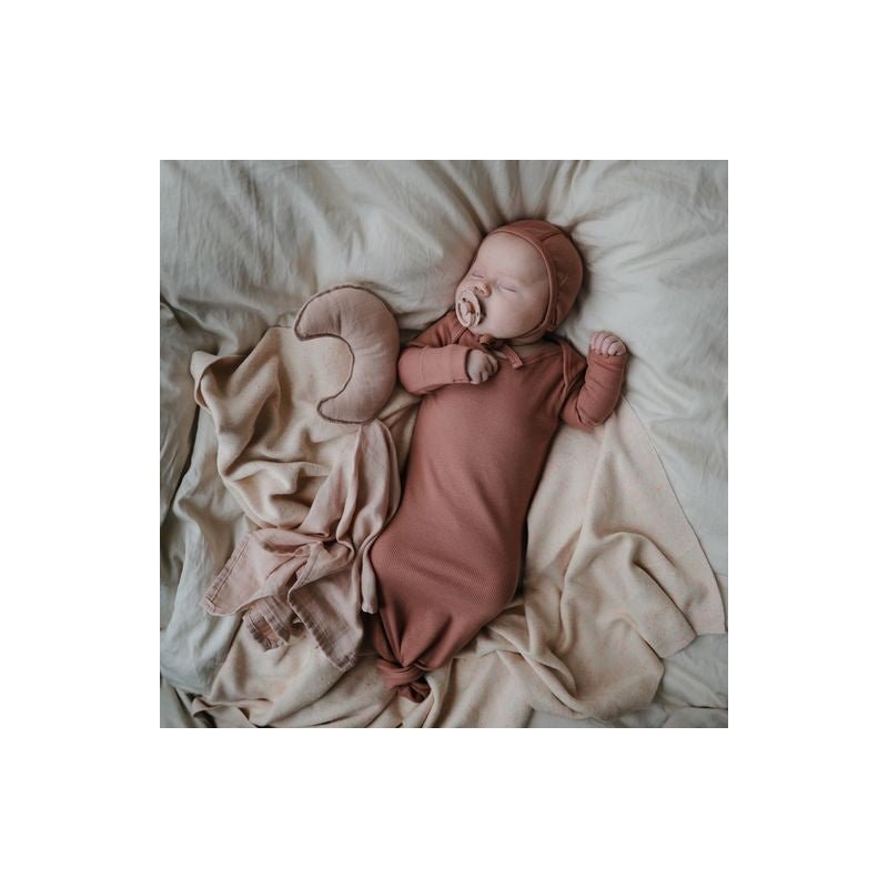 Slaapzakje voor pasgeboren baby’s van het merk Mushie met een knoopsluiting aan de onderkant. Geschikt voor baby’s 0 t/m 3 maanden. De slaapzak is gemaakt van biologisch katoen en speciaal gemaakt voor newborns. De onderkant is te sluiten met een knoop wat het eenvoudig maakt om de baby te verschonen.
