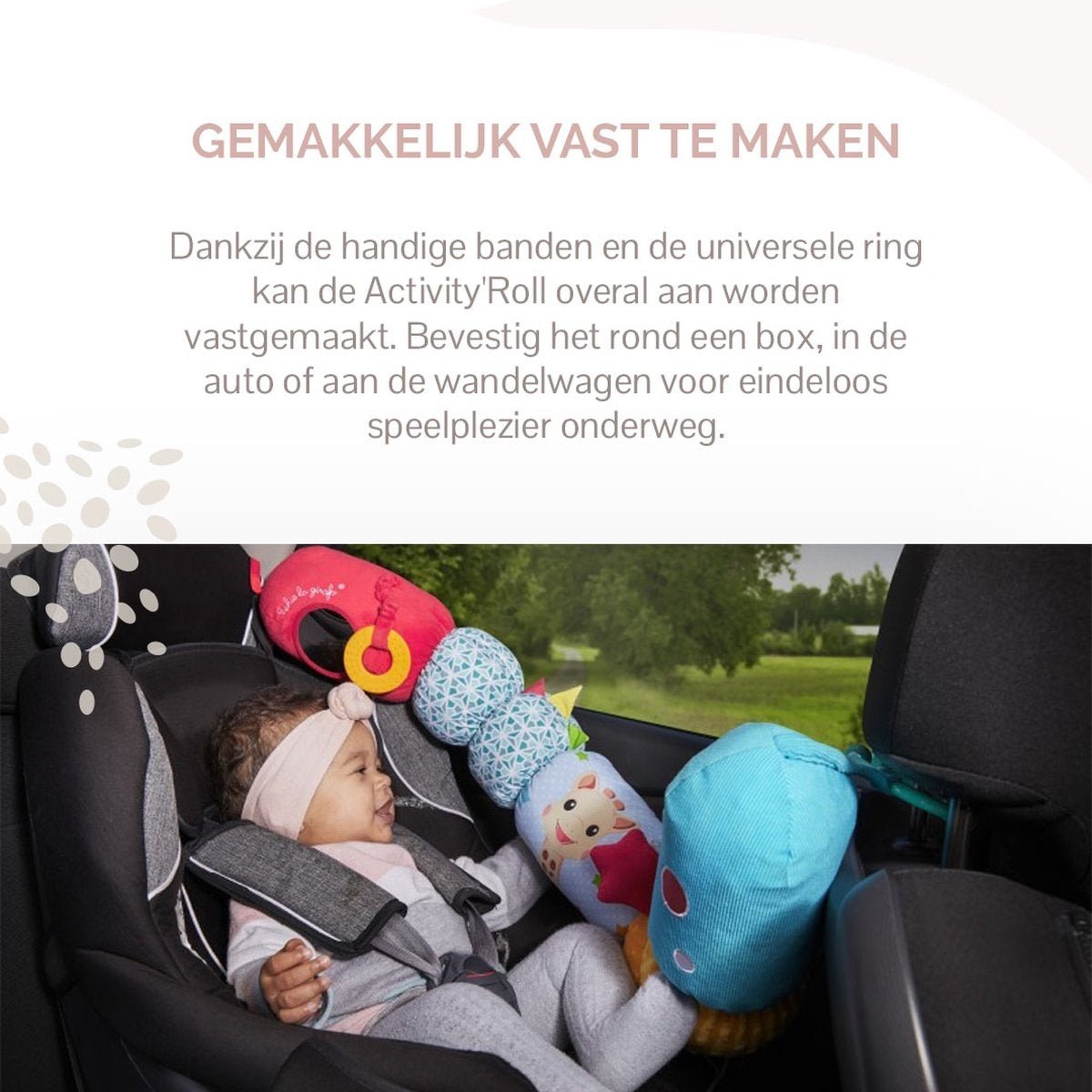 Dankzij de handige banden en de universele ring kan de Activity'Roll overal aan worden vastgemaakt. Bevestig het rond een box, in de auto of aan de wandelwagen voor eindeloos speelplezier onderweg.