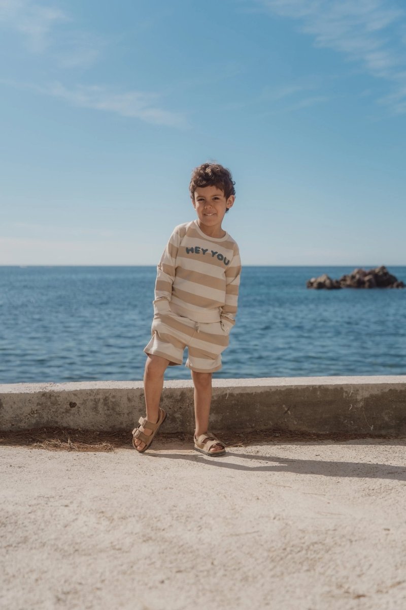 Zacht, stoer en altijd klaar om te knuffelen: deze sweater in biscuitkleur met brede strepen is perfect voor frisse dagen. De lichte sweatkwaliteit voelt heerlijk zacht aan en houdt je kleintje comfortabel warm. Op de borst staan geborduurde letters met de tekst Hey You, een vrolijke knipoog voor elke dag. De contrasterende boorden geven een speels accent. Gemaakt van 100% biologisch katoen en Oeko-Tex gecertificeerd, is deze trui zacht voor de huid en ideaal om in te bewegen en te spelen.