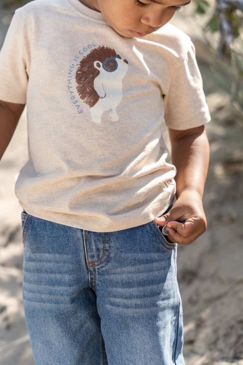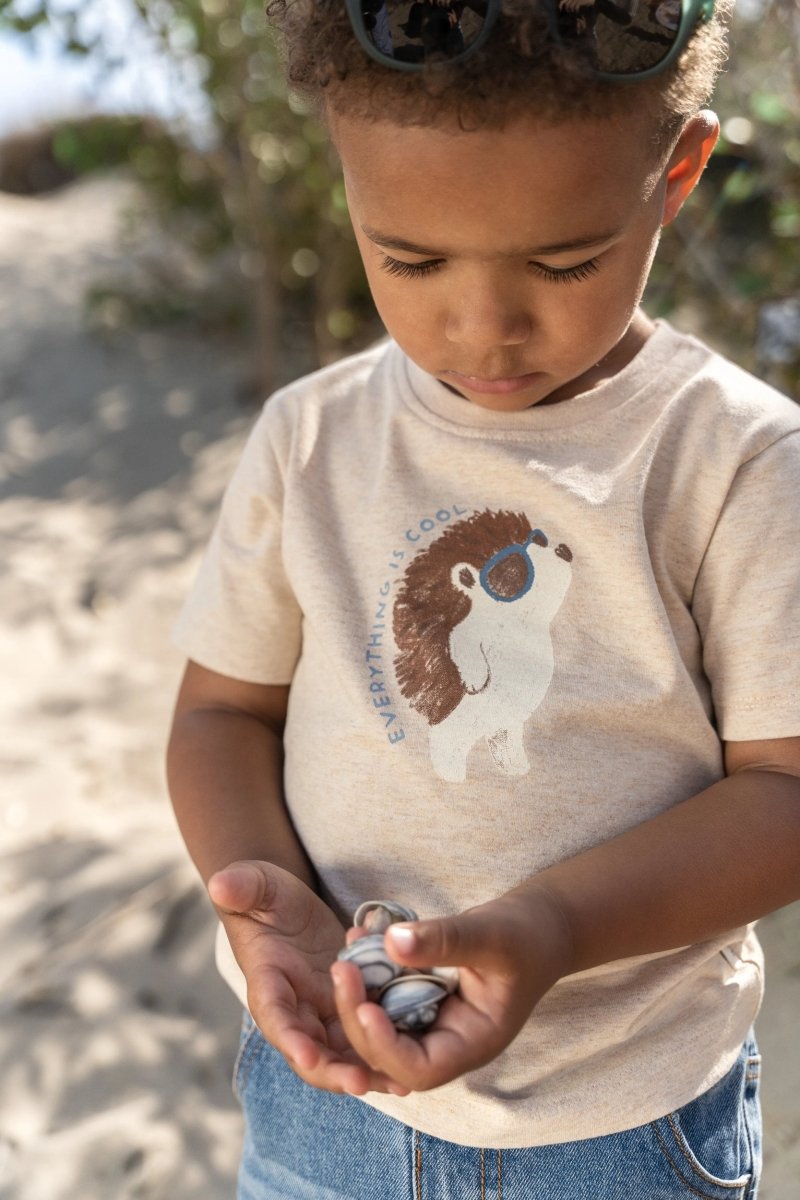 Dit T-shirt in biscuit melange combineert een tikkeltje eigenwijsheid met heerlijk draagcomfort. De gemêleerde zandkleur past perfect bij warme dagen, terwijl het vrolijke bosvriendje op de borst met zonnebril zorgt voor een speels en avontuurlijk accent. Gemaakt van 97% biologisch katoen en 3% elastaan, Oeko-Tex gecertificeerd, voelt het shirt zacht aan op de huid en is het een bewuste keuze. De drukknoopjes op de schouder maken aan- en uitkleden extra eenvoudig.