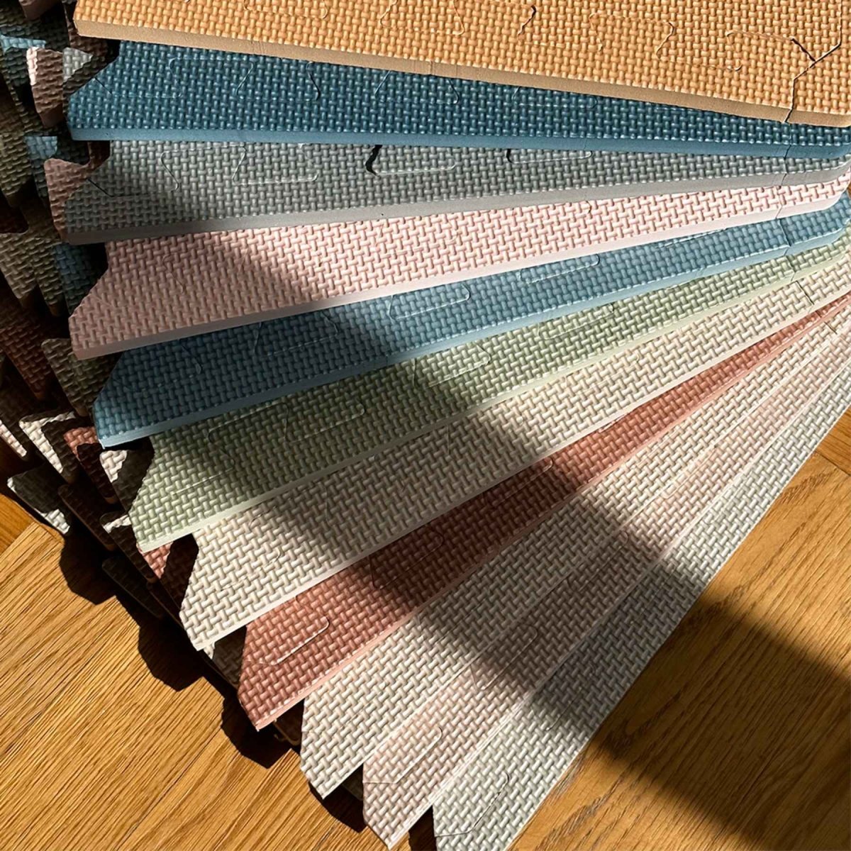 Let op bij het kopen van een nieuwe schuimrubberen speelmat: wanneer de speelmat op de vloer ligt, kan de zon de schuimrubberen speelmat verbleken. Daarom kan het voorkomen dat de kleuren van de matten niet overeenkomen bij aankoop van een nieuwe mat.