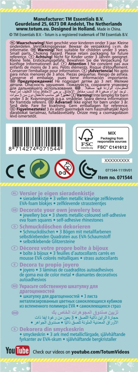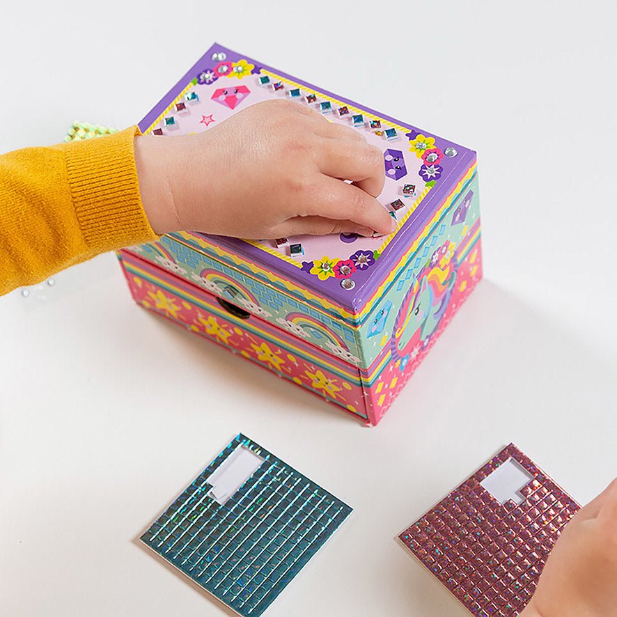 Versier je eigen sieradenkistje. Dit kistje heeft een vrolijk design in eenhoorn thema. Wat nog leuker is aan deze sierandenkist: je kunt zelf bepalen hoe hij eruit komt te zien! Beplak het kistje met de zelfklevende metallic foam blokjes en zelfklevende strassteentjes. Nu heb je al je sieraden bij elkaar in een mooie zelfgemaakte sieraden kist.