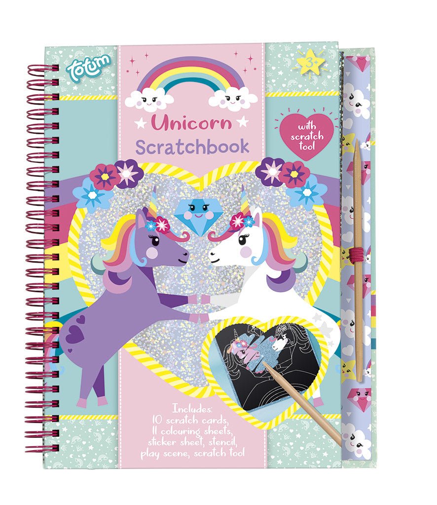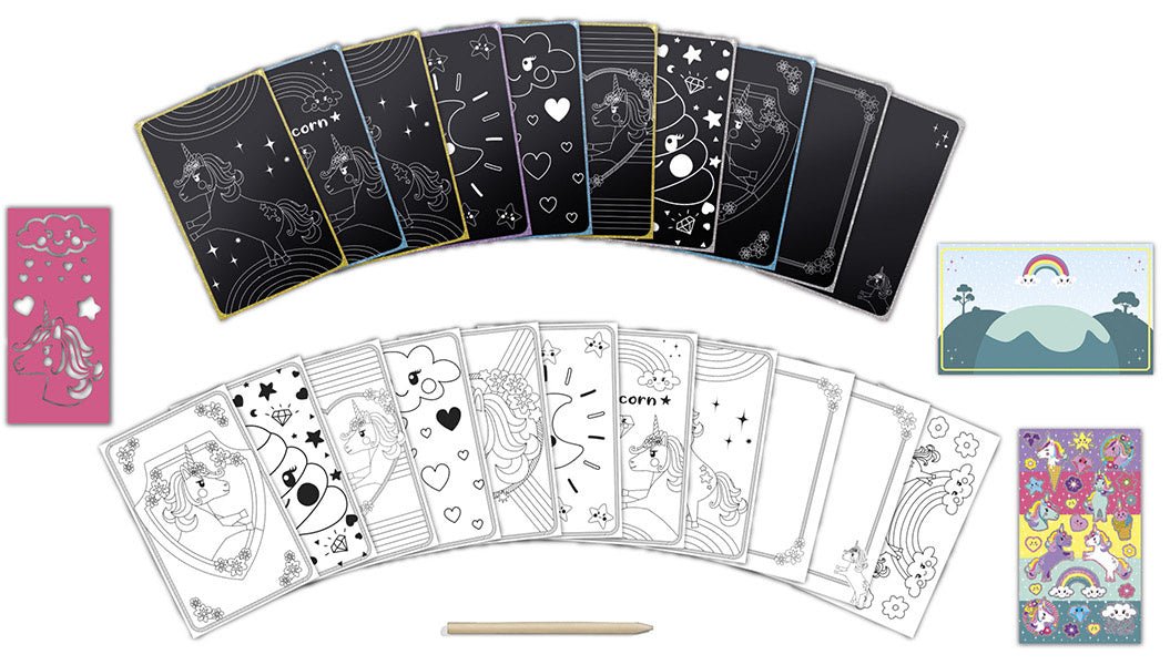 Een leuk Unicorn activiteiten boekje met 10 kraskaarten, kraspen, 11 kleurplaten, een stencil, stickers en achtergrond. Gebruik de achtergrond voor je stickers of om je kleurplaat op te vrolijken.